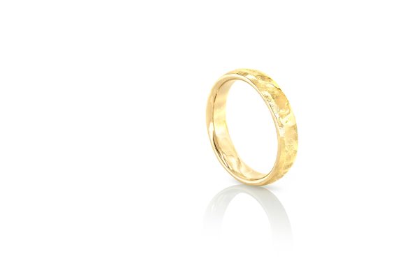 Alliance pour homme aux lignes inégales, travaillée entièrement façon forge pour apporter en surface un effet brut, mais dont les courbes arrondies propres aux joncs apportent un supplément de douceur.