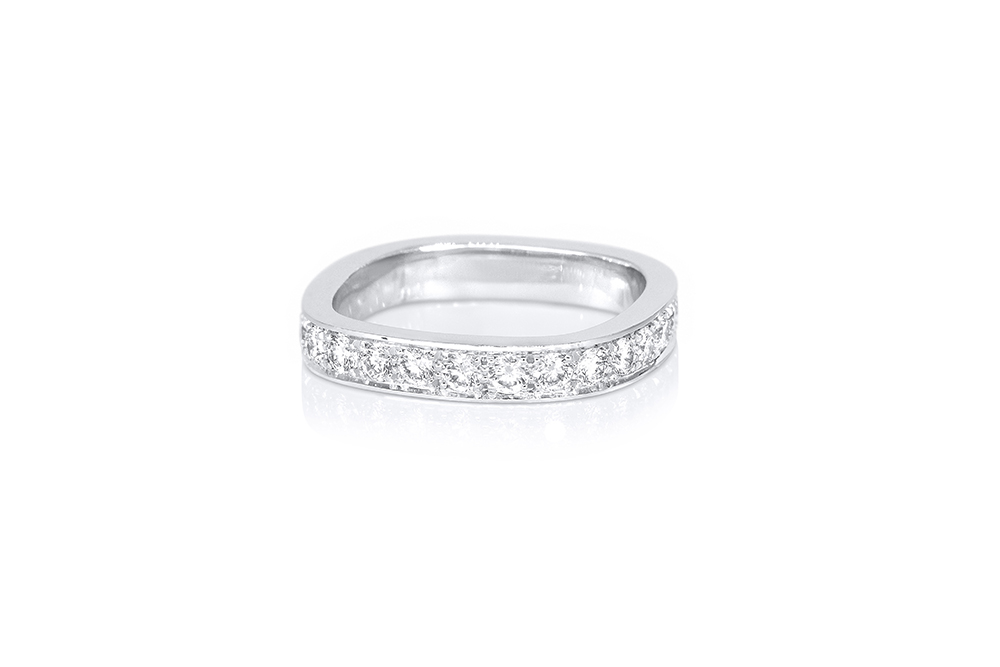 Alliance en or blanc 18 carats, incrustée de diamants, aux angles arrondis apportant beaucoup de douceur au bijou.
