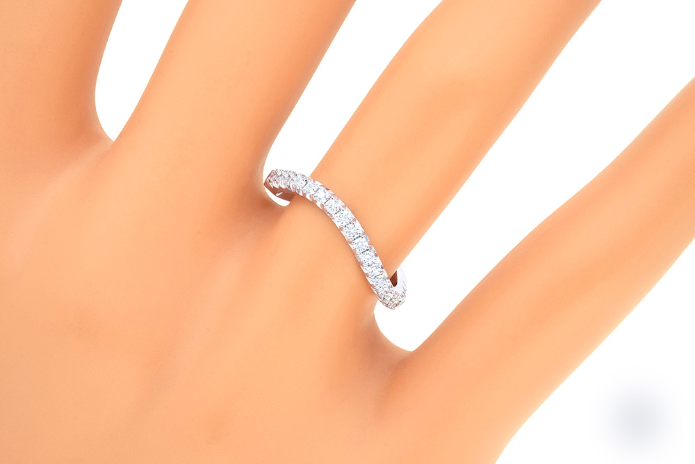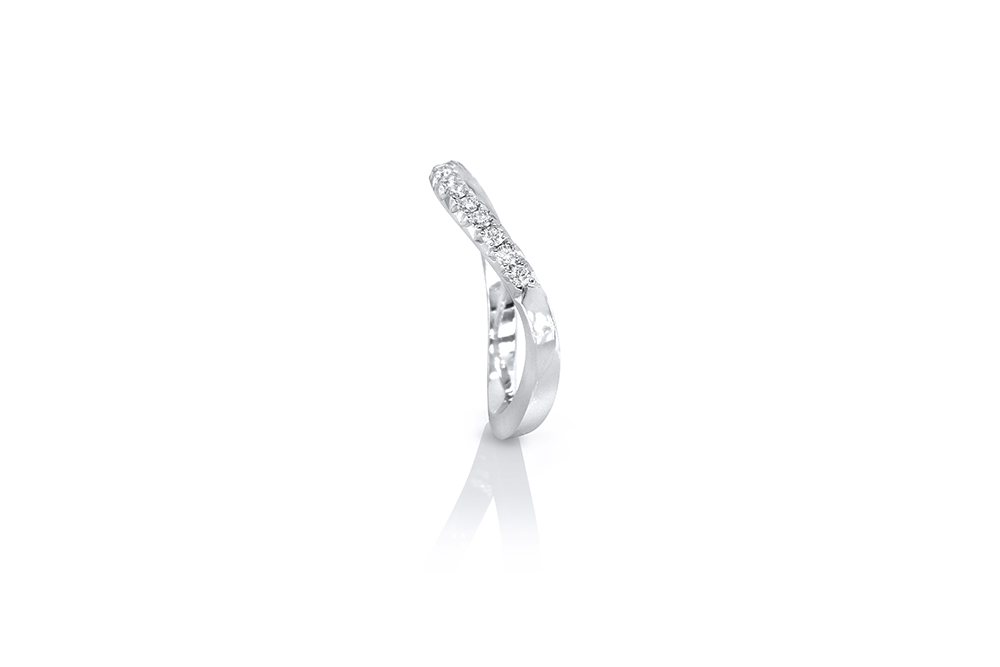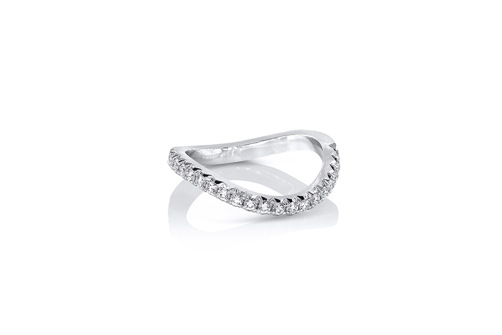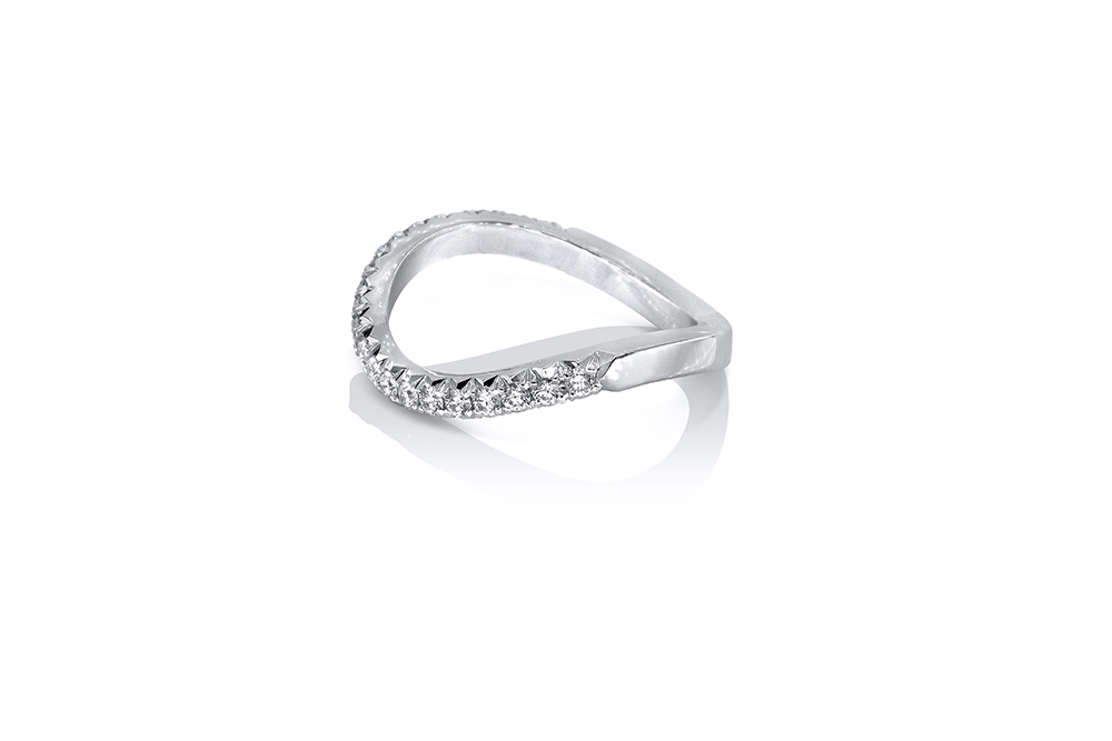 Bague de mariage en or blanc 18 carats et diamants, aux lignes courbes et épurées, conçue pour épouser les formes arrondies du Solitaire Princesse Orientale. Le pavage de diamants a été monté en serti descendu pour plus de légèreté.