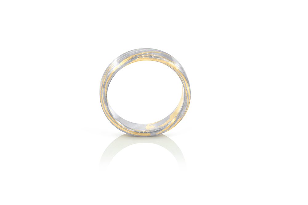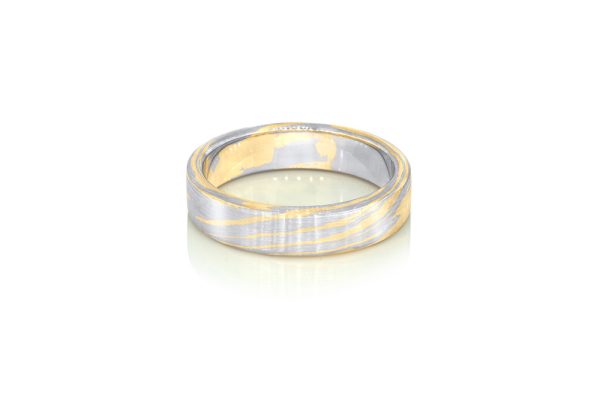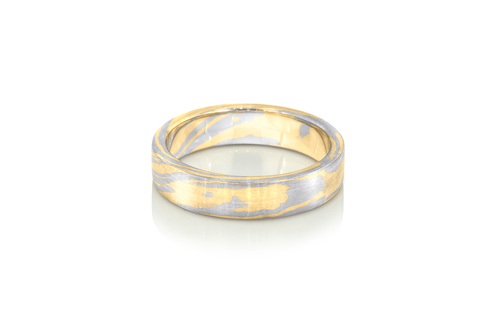 Alliance appartenant à la Collection Mokume-Gane de la Maison Arabian, basée sur une technique japonaise ancestrale permettant de produire un métal laminé dont les différentes couches sont visibles. Mokume-gane pourrait se traduire par « métal au grain de bois », décrivant ainsi l’apparence d’un métal ressemblant au veinage naturel du bois.