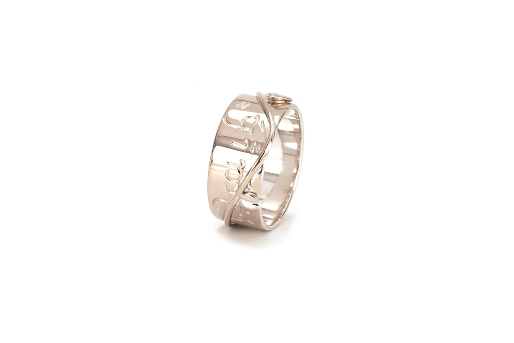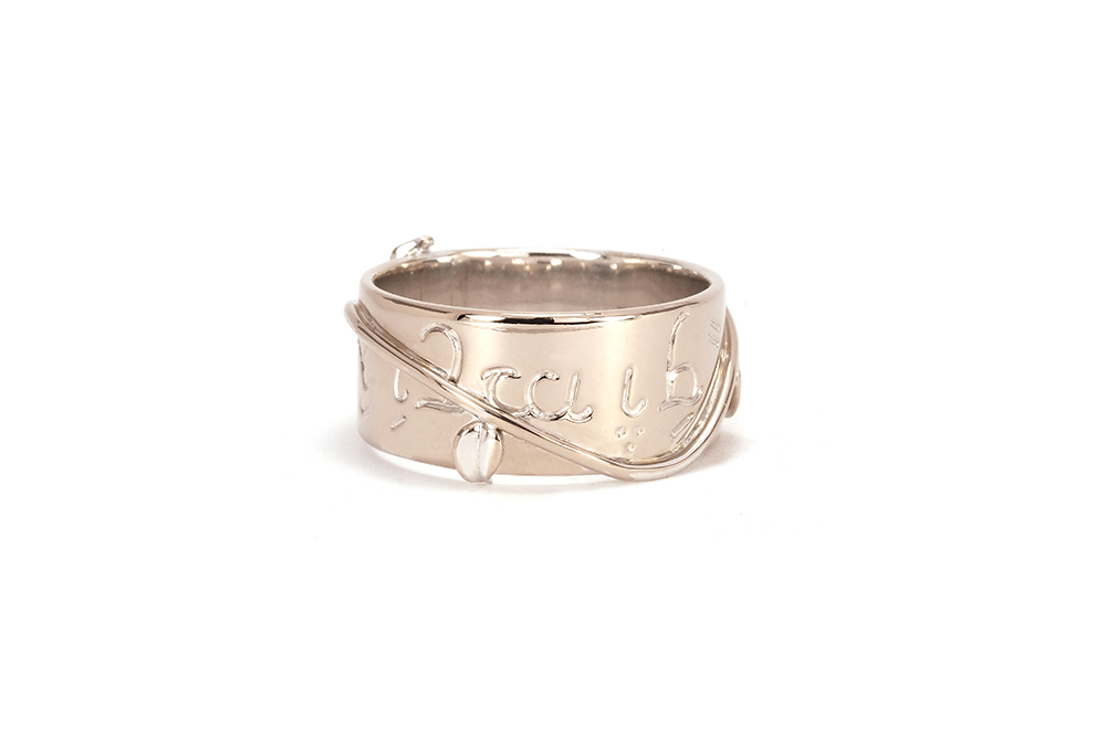 Alliance en or blanc gravée à la main d’une inscription elfique et sertie d’un diamant. Cette alliance appartient à la Collection Bloom de la Maison Arabian, déclinaison inspirée autour de l’arbre de vie, et a été conçue pour un homme.
