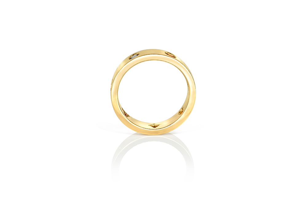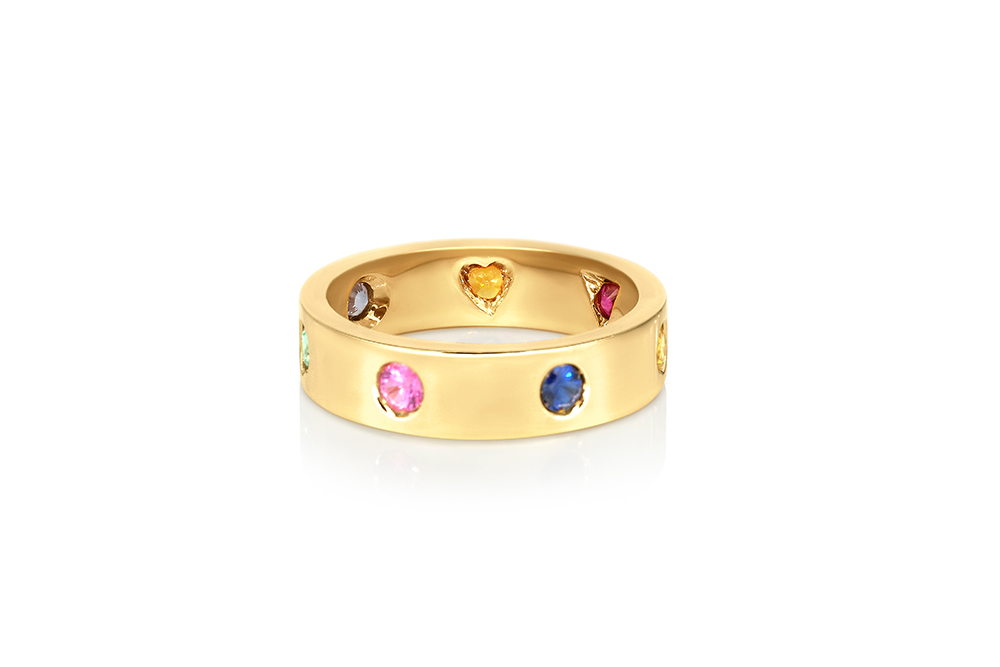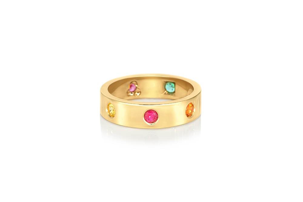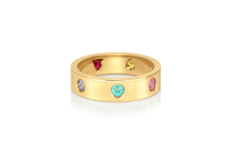 Alliance en or jaune 18 carats sertie de 7 magnifiques pierres fines et précieuses, aux mises à jour uniques.