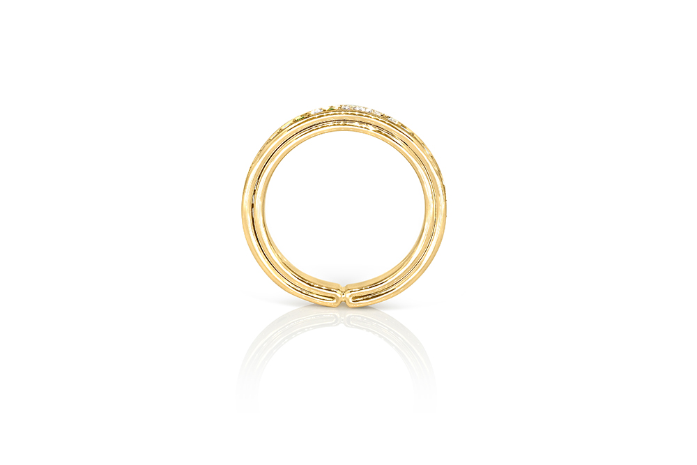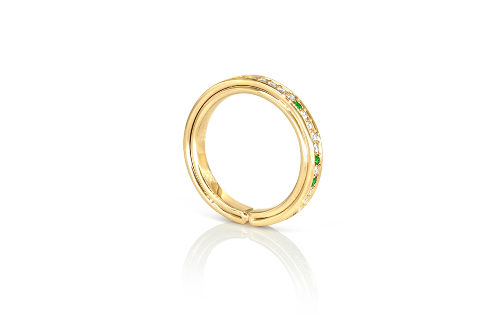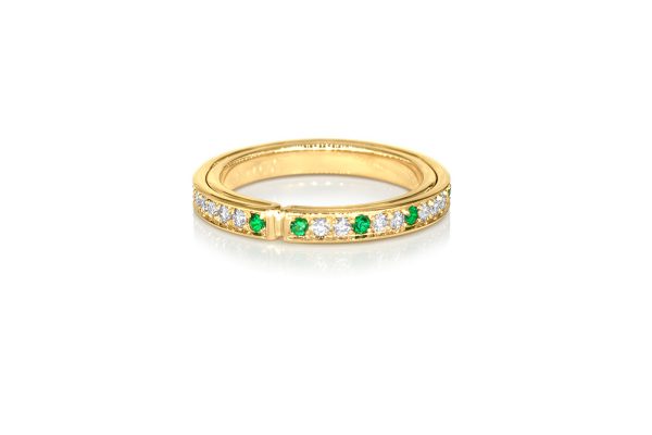 Alliance appartenant à la Collection Ruban de la Maison Arabian, déclinaison inspirée de la douceur et du soyeux de l’étoffe. Ici, un simple ruban d’or jaune 18 carats enroulé se fait le support d’une ligne de diamants parsemée d’émeraudes.