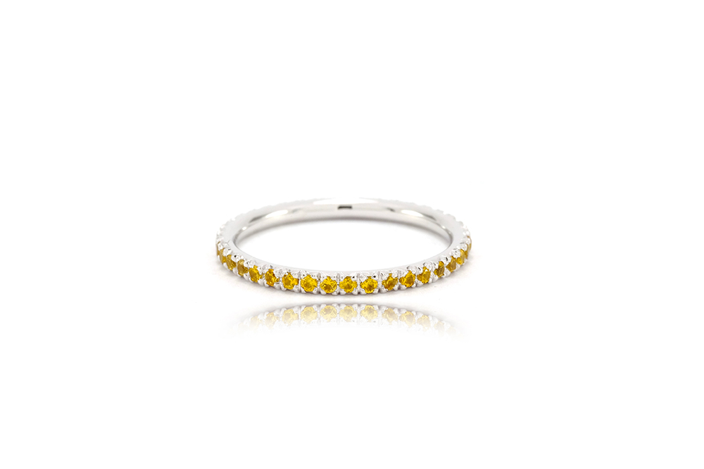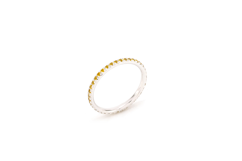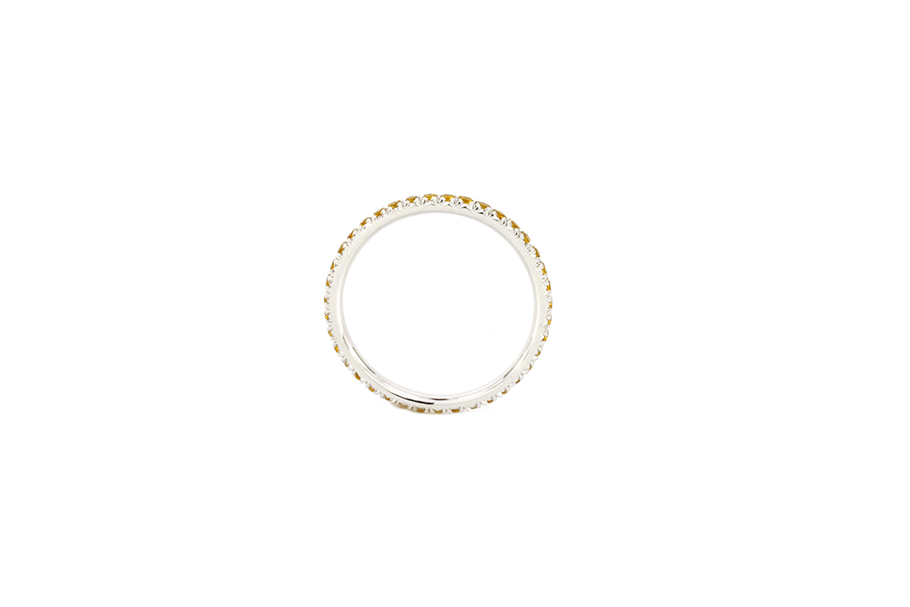 Imaginée en or blanc 18 carats, cette bague tire son originalité de la technique employée pour sertir les 40 saphirs jaunes qui l’ornent : un serti descendu, permettant de mettre en valeur leur couleur éclatante.