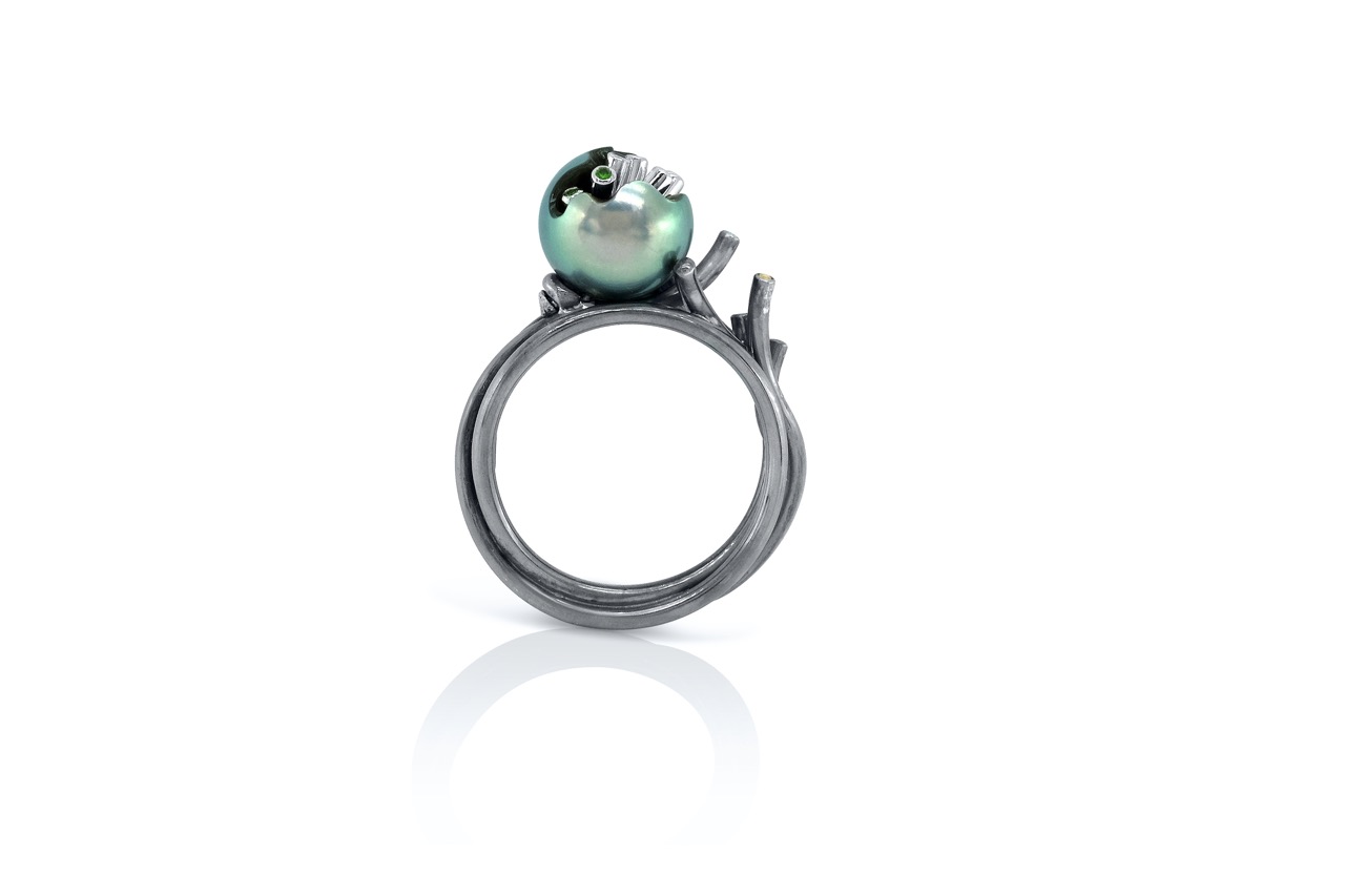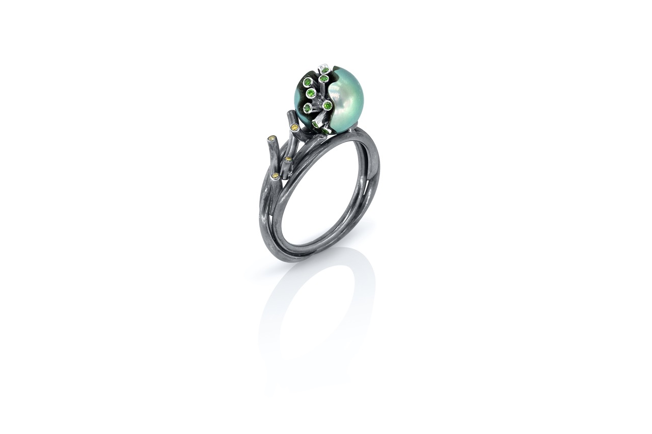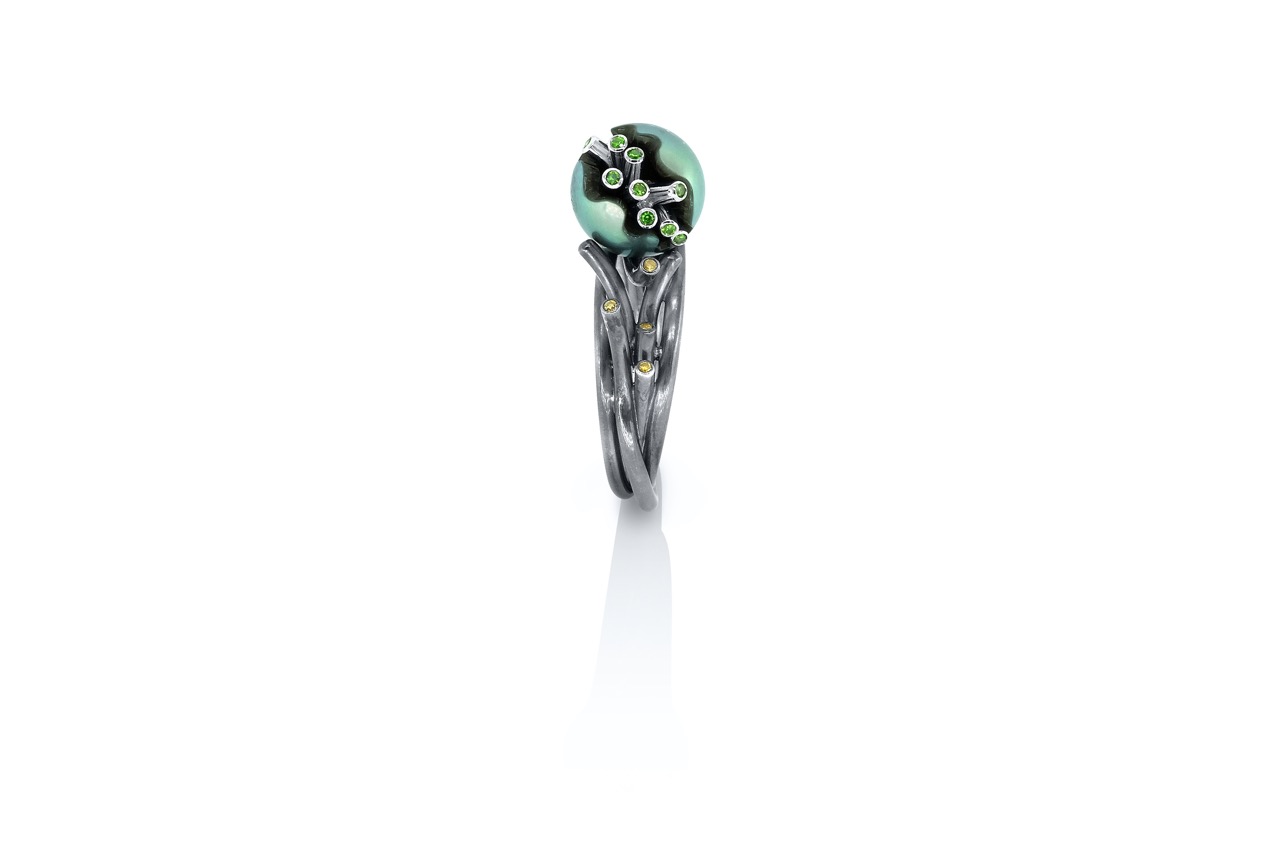 Il s’agit ici d’un ensemble de diamants jaunes et grenats démantoïde sertis dans une demi perle de Tahiti et sur le corps de bague dans une découpe tout en rondeur et en mouvements qui évoquent immanquablement l’anémone de mer.