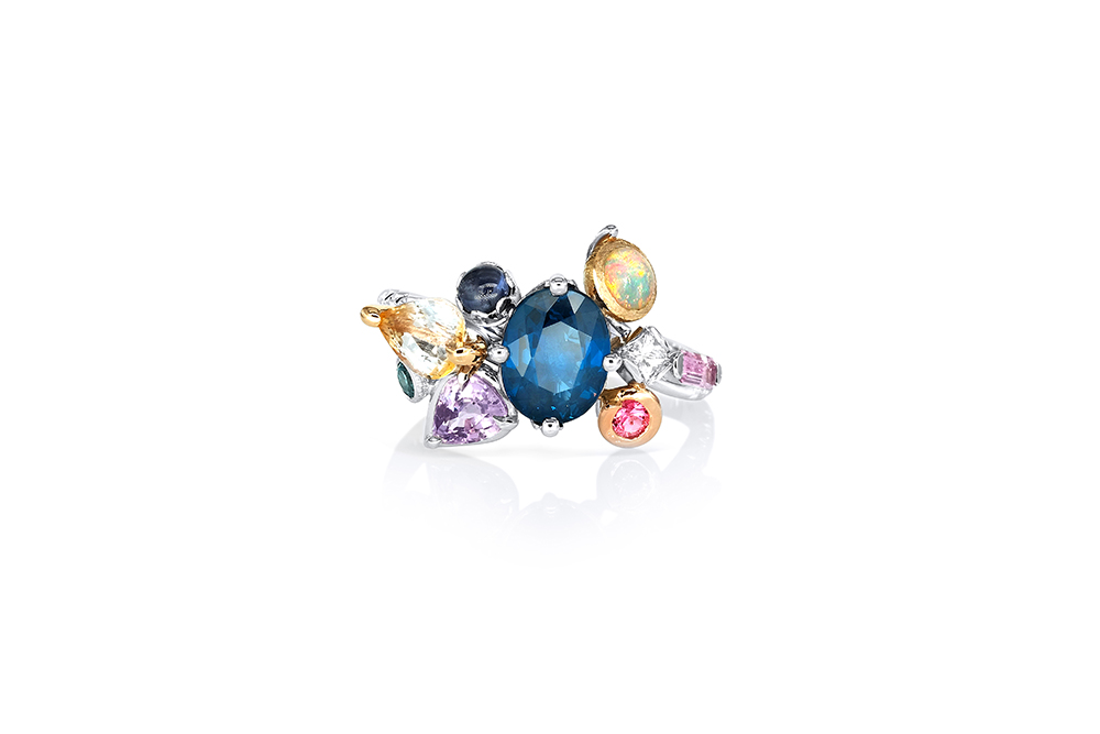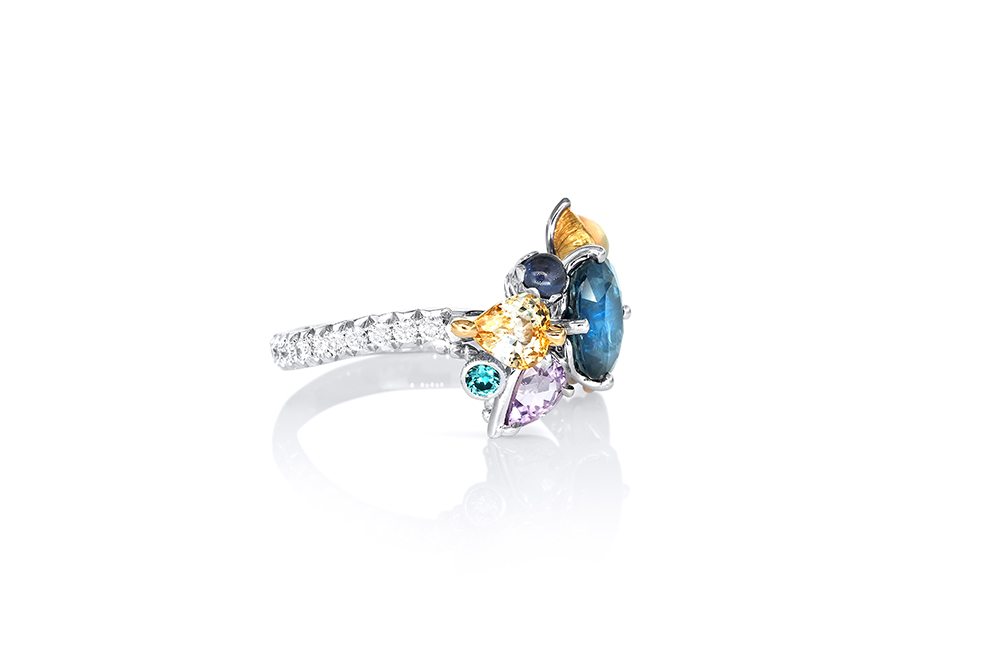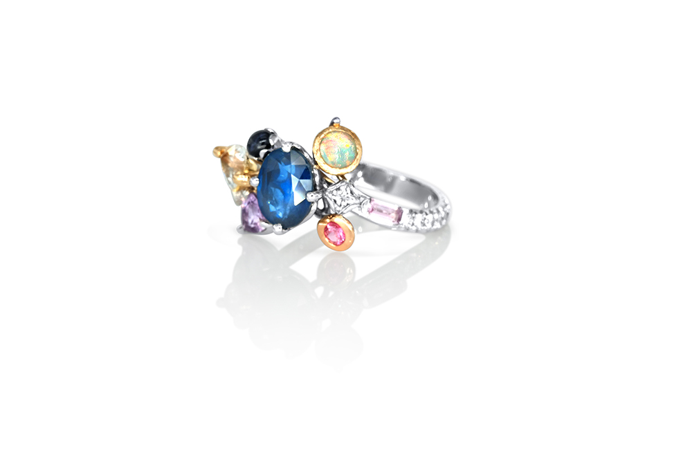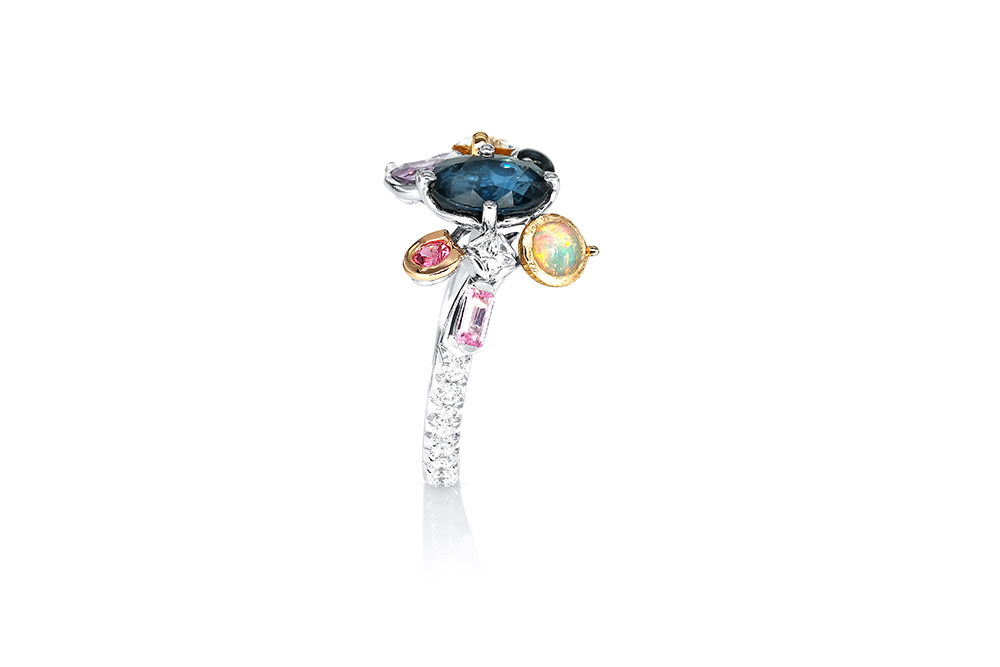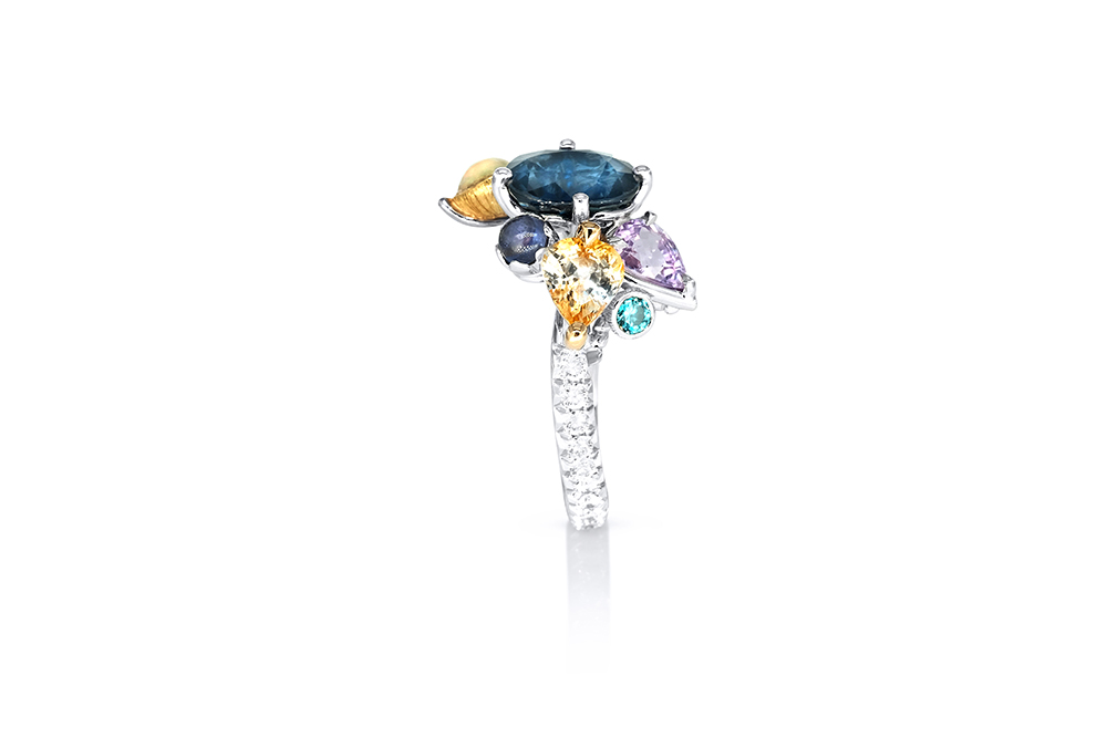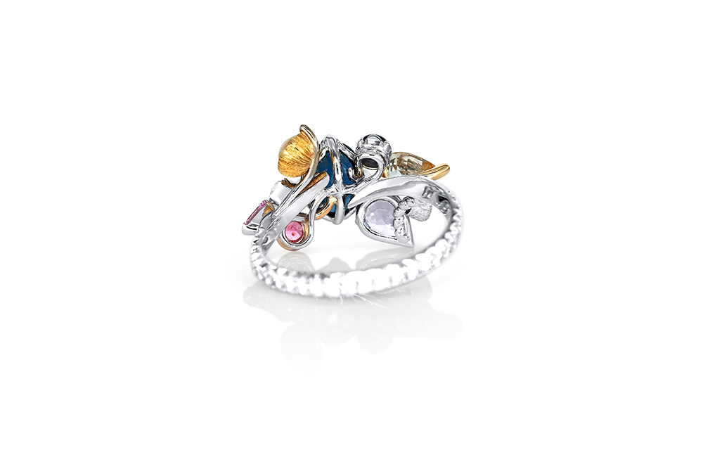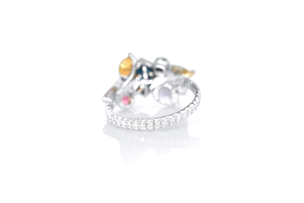 Bague en or blanc palladié, or jaune et or rouge 18 carats appartenant à la Collection Epicure de la Maison Arabian, caractérisée par une conception unique tant au niveau de l’originalité des nombreux sertis que du choix des pierres.
