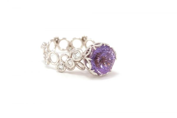 Bague composée de dizaines d’anneaux en or blanc 18 carats soudés les uns aux autres, surmontée d’une améthyste de près de 5 carats taillée spécialement pour cette création. 12 diamants sont par ailleurs disséminés sur les flancs de la bague.