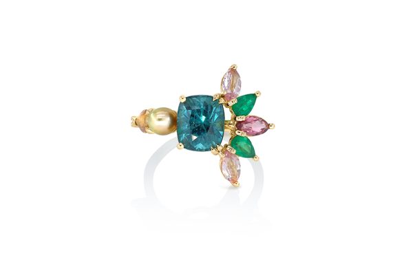 Bague en or jaune 18 carats appartenant à la Collection Epicure de la Maison Arabian, caractérisée par une conception unique tant au niveau de l’originalité des nombreux sertis que du choix des pierres.