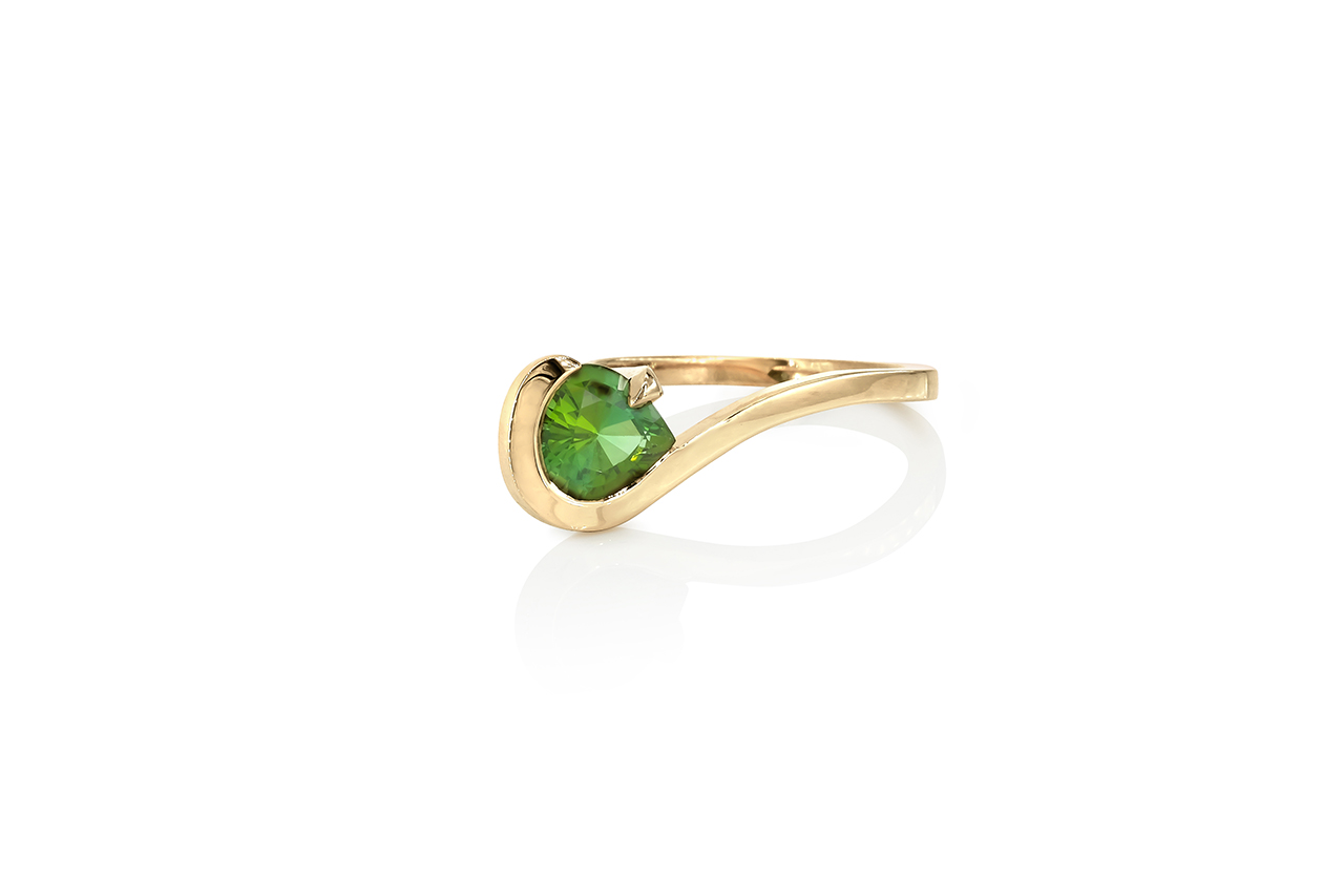Bague en or jaune 18 carats surmontée d’un splendide Tourmaline verte taille poire et pesant 1,840 carats.