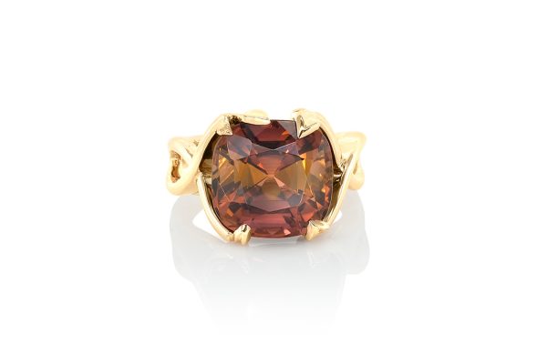 Bague en or rouge 18 carats mettant en avant une tourmaline bicolore taille coussin sertie par les feuilles naissant du corps de la bague, qui préfigure une liane.