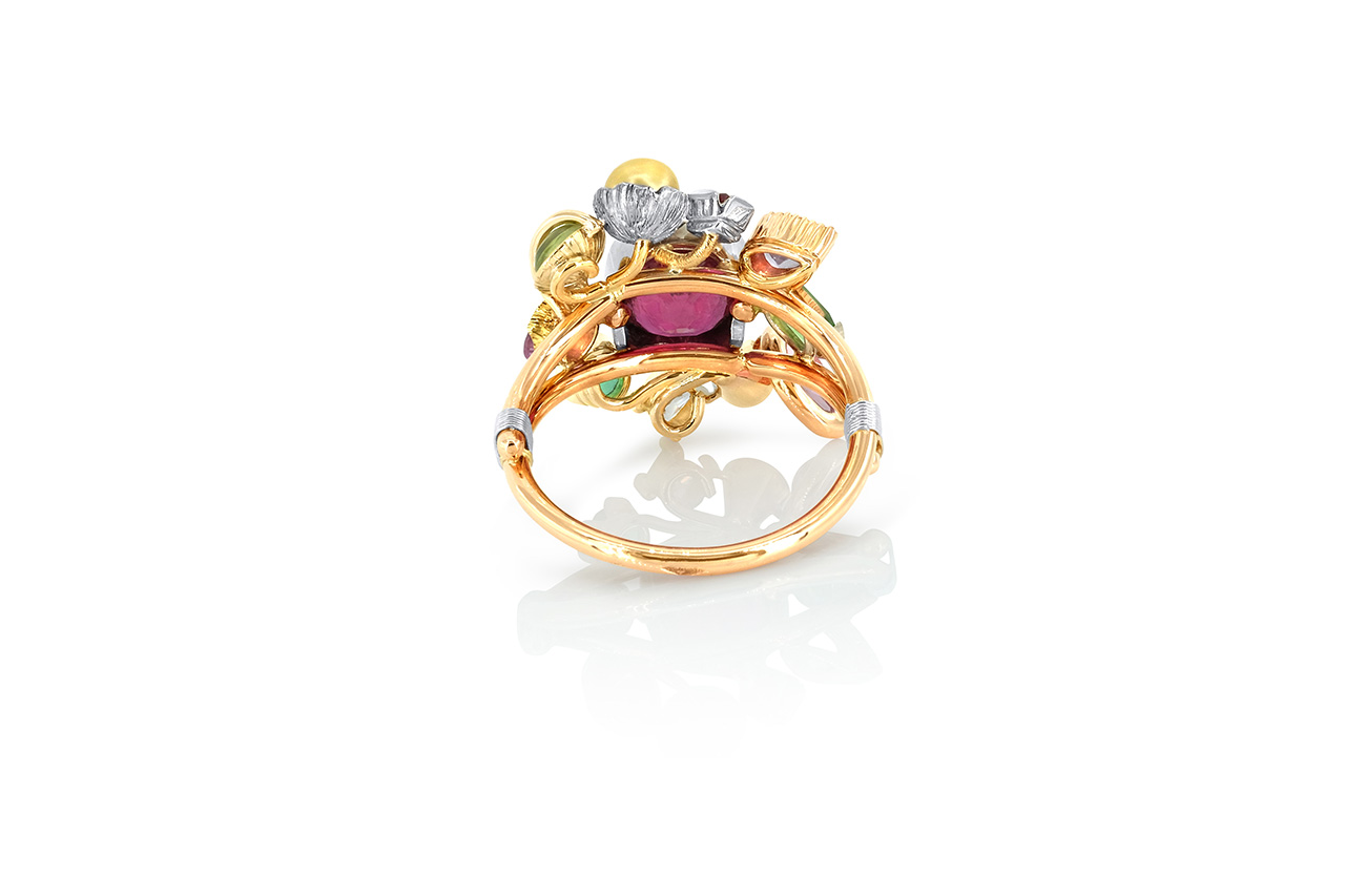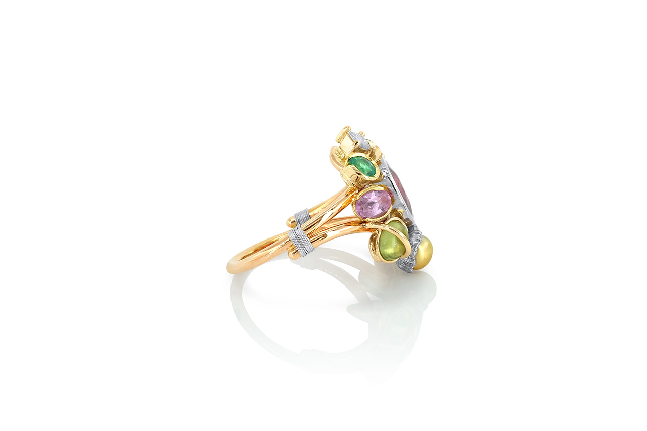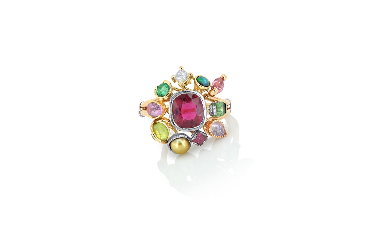 Le bijoutier a ici laissé libre cours à sa créativité pour présenter une variété de pierres précieuses et de pierres fines, toutes maintenues par des sertis différents pour un rendu définitivement original.
