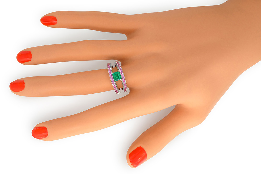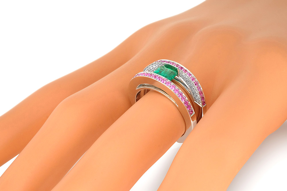 C’est ainsi que 42 saphirs rose ont trouvé place de part et d’autre de l’émeraude, eux-mêmes rehaussés à l’intérieur de la bague de 76 diamants blancs.