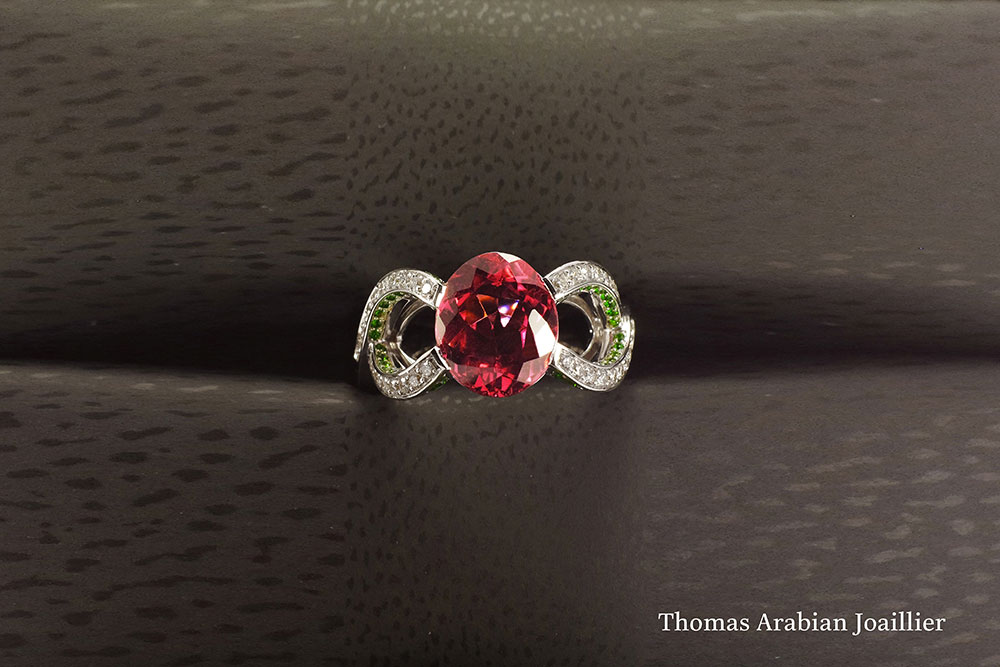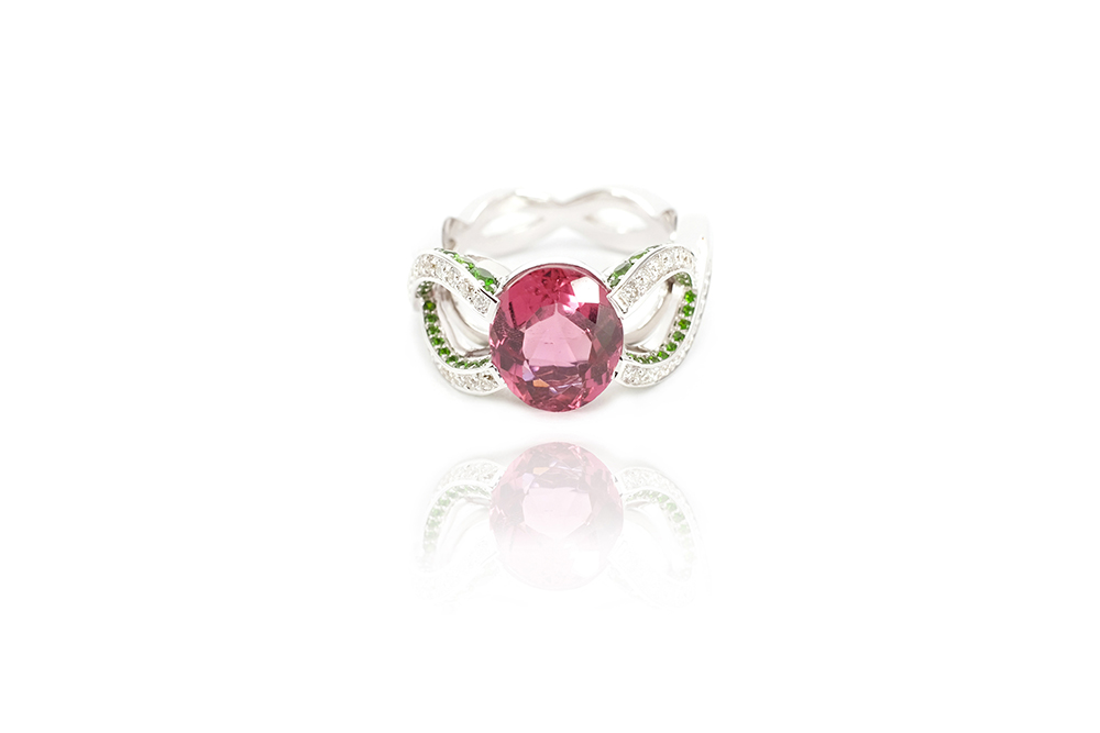 Jouant à la fois sur les couleurs et les volumes, la teinte de la tourmaline est mise en valeur au moyen d’un subtil entrelacs de tsavorites et de diamants montés en sertis grain et griffes, et s’ajustant aussi bien sur le dessus de la bague que sur la tranche des courbes, pour un résultat particulièrement original.