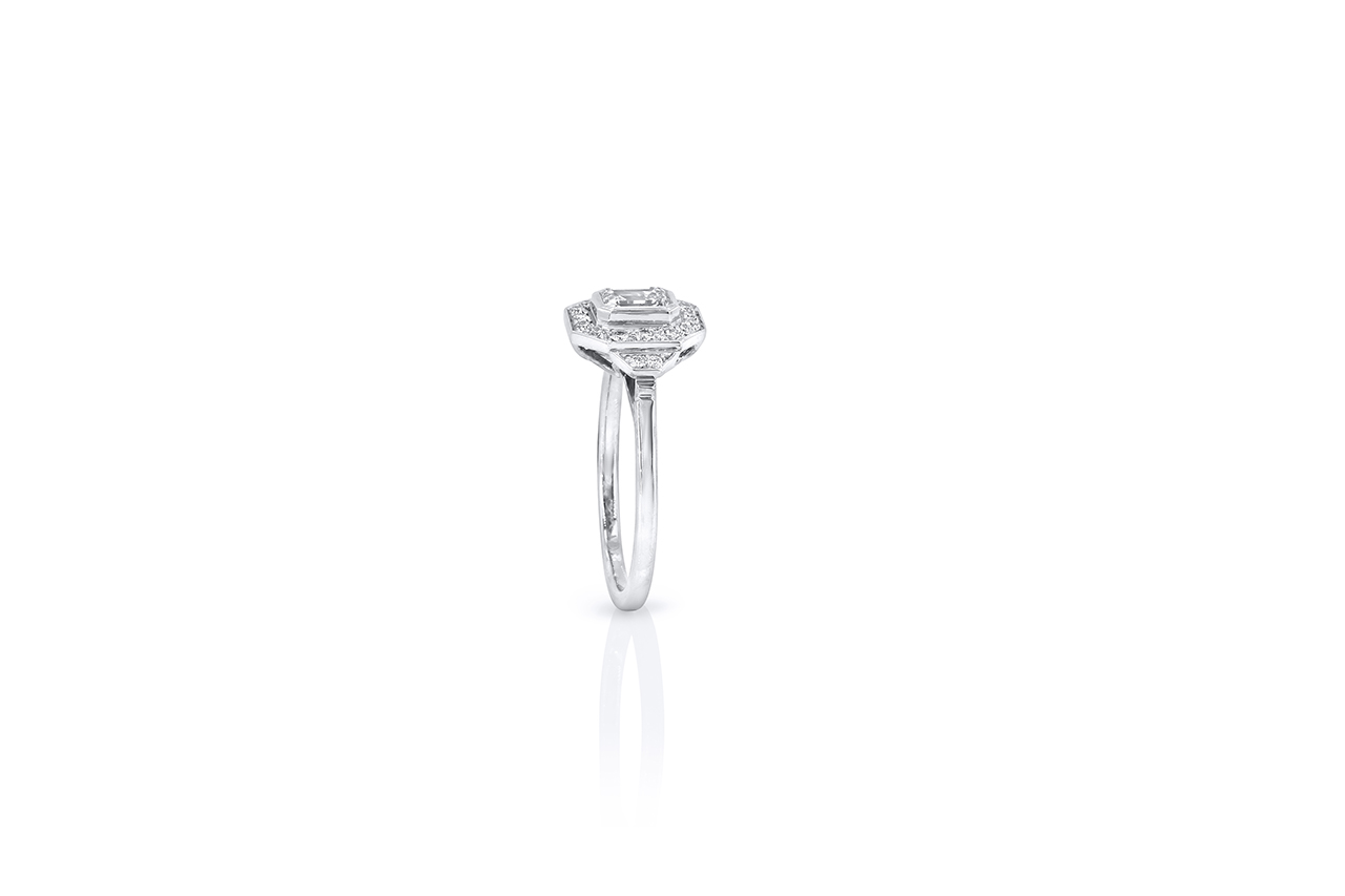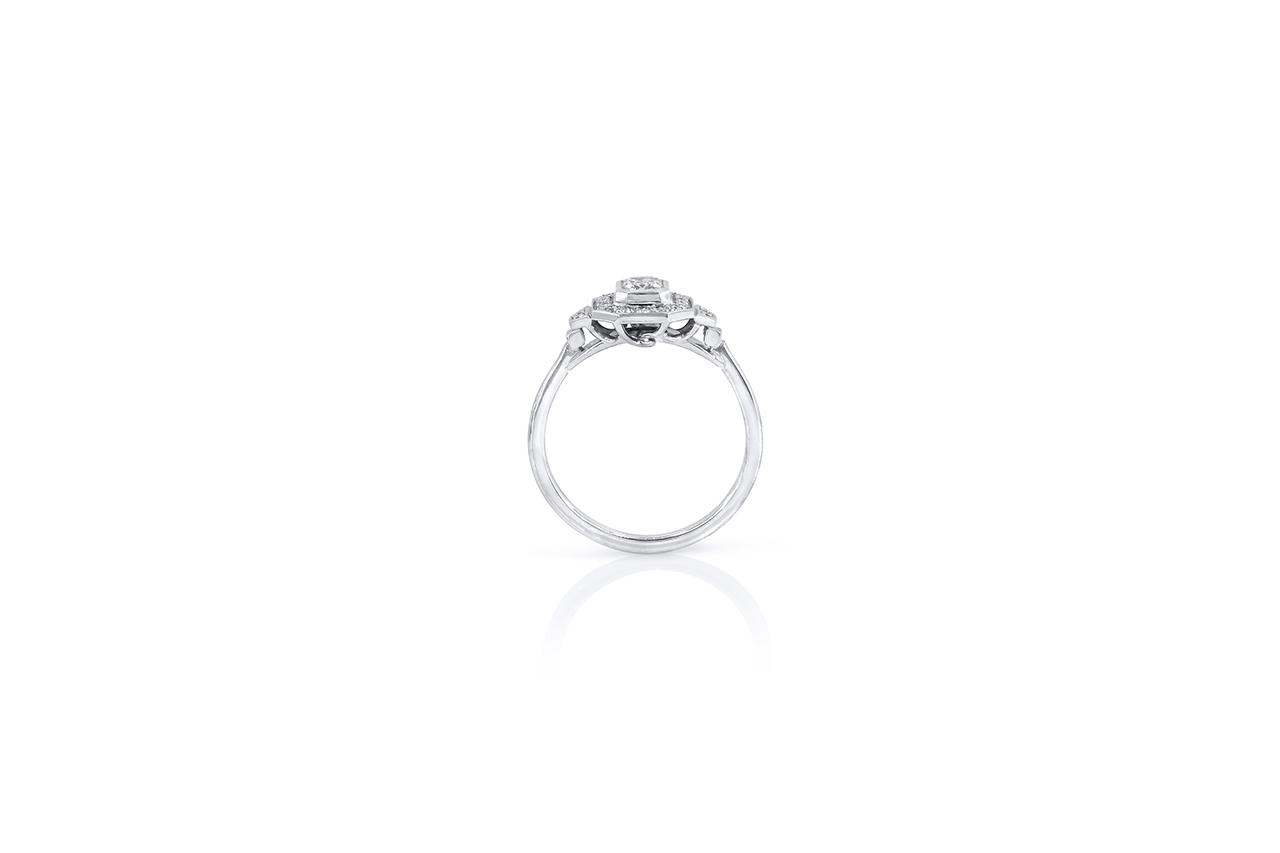 Une création dans le style Art Déco avec des diamants « taille moderne ». Cette bague se décline également en version diamant central taille radiant.