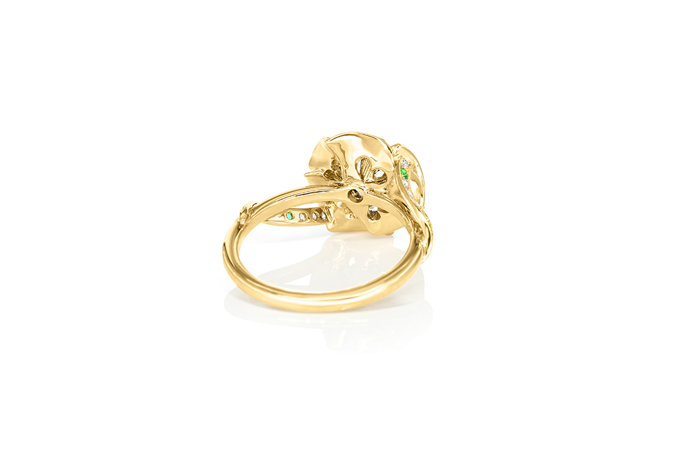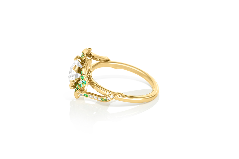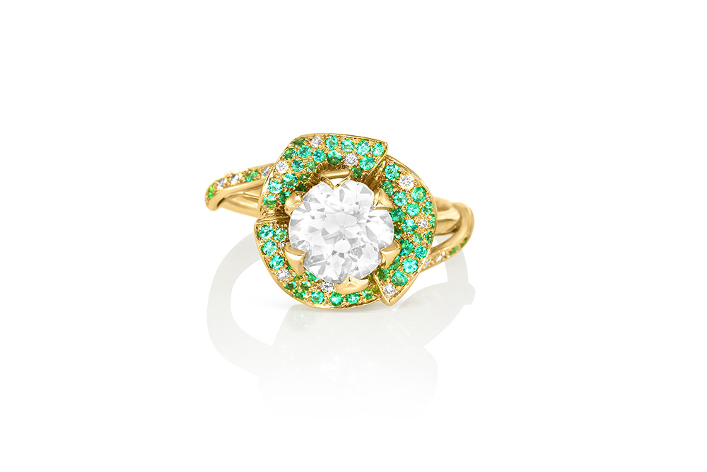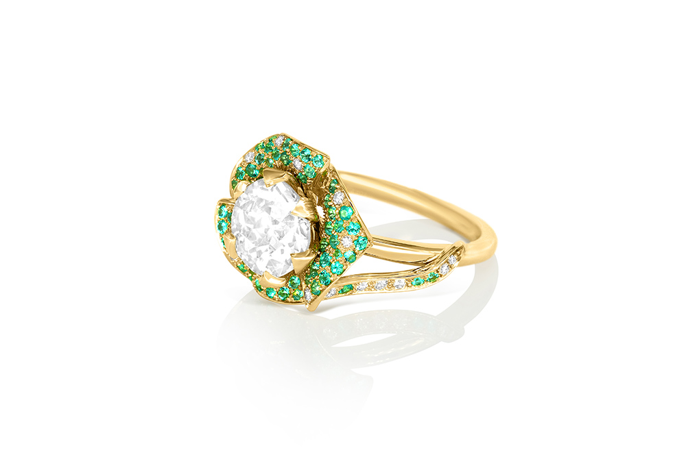 Bague en or jaune 18 carats, sculptée en forme de rose, sertie en son centre d’un diamant taille brillant, et pavée de diamants et de tourmalines Paraïba à la couleur intense sur les pétales.