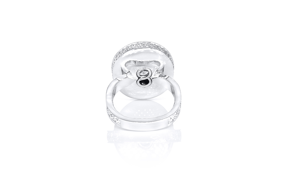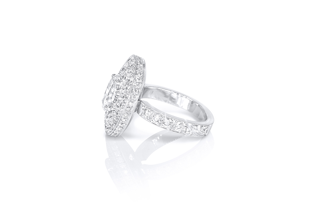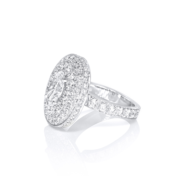 Bague de fiançailles en or blanc 18 carats conçue afin de mettre en avant l’éclat saisissant d’un diamant taille ovale, absolument pur, de qualité D flawless type A2 serti en son centre. Il est entouré de plus de 2 carats de diamants taille brillant.