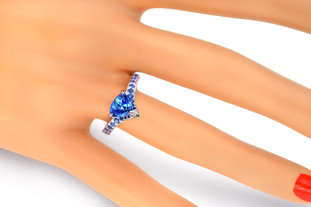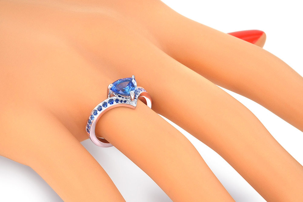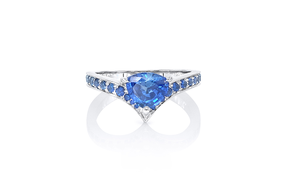 Solitaire en or blanc 18 carats serti en son centre d’un saphir bleu taille troidia, et rehaussé d’un dégradé de saphirs bleus.