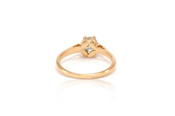 Solitaire en or jaune 18 carats surmonté d’un diamant retaillé serti par 6 griffes massées dans un chaton type illusion (1900).