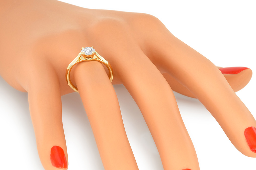 Solitaire en or jaune 18 carats très épuré, présentant un diamant taille brillant certifié maintenu par un serti 4 griffes, sur un corps de bague à la finition en arêtes.