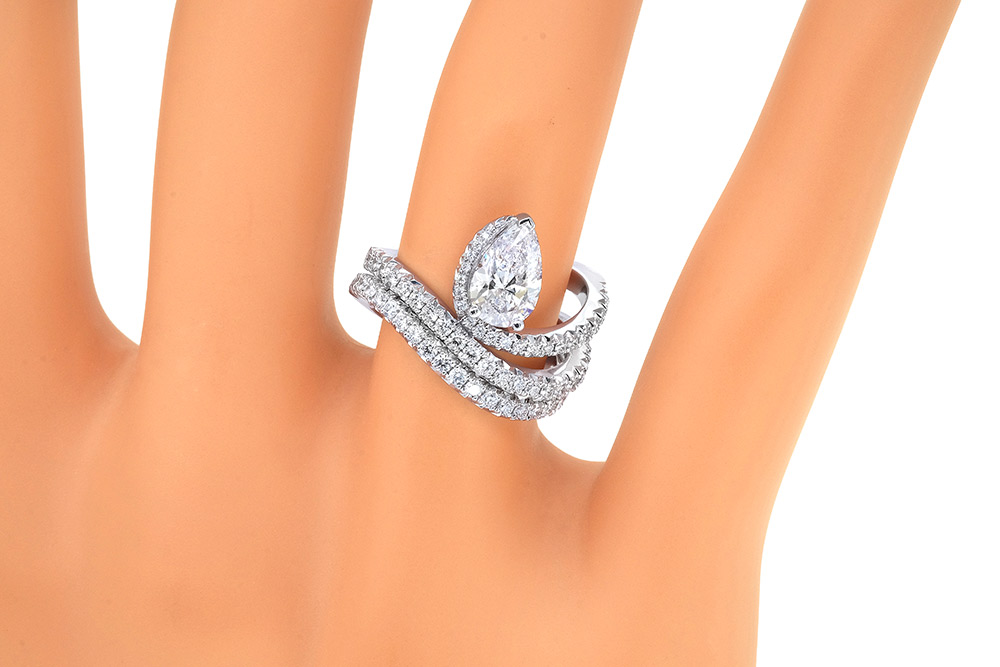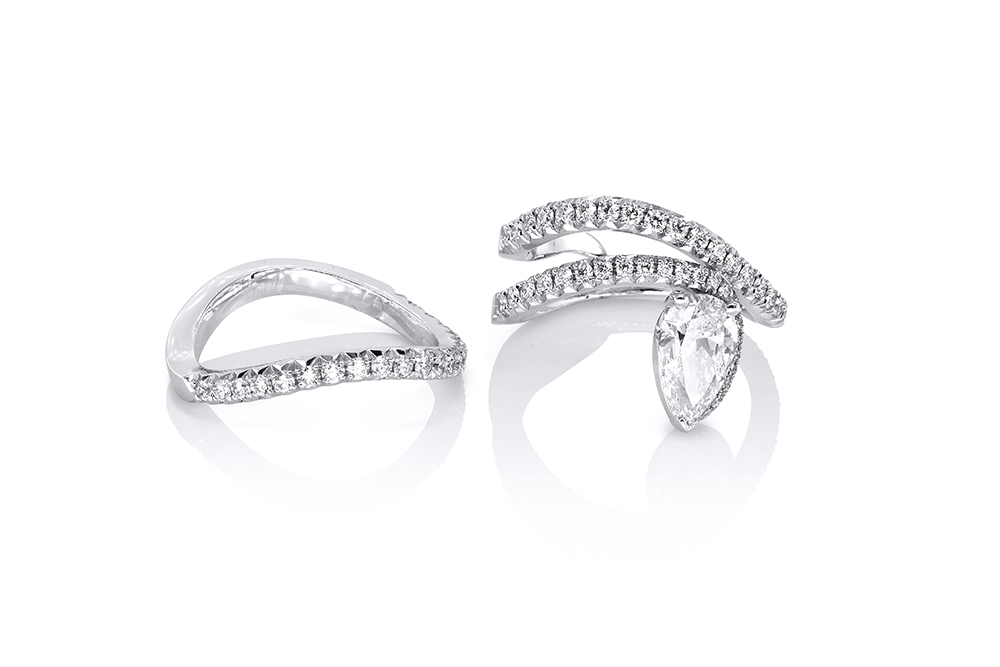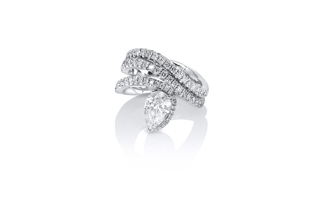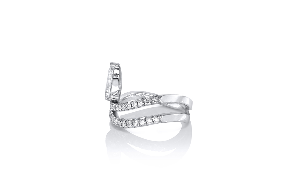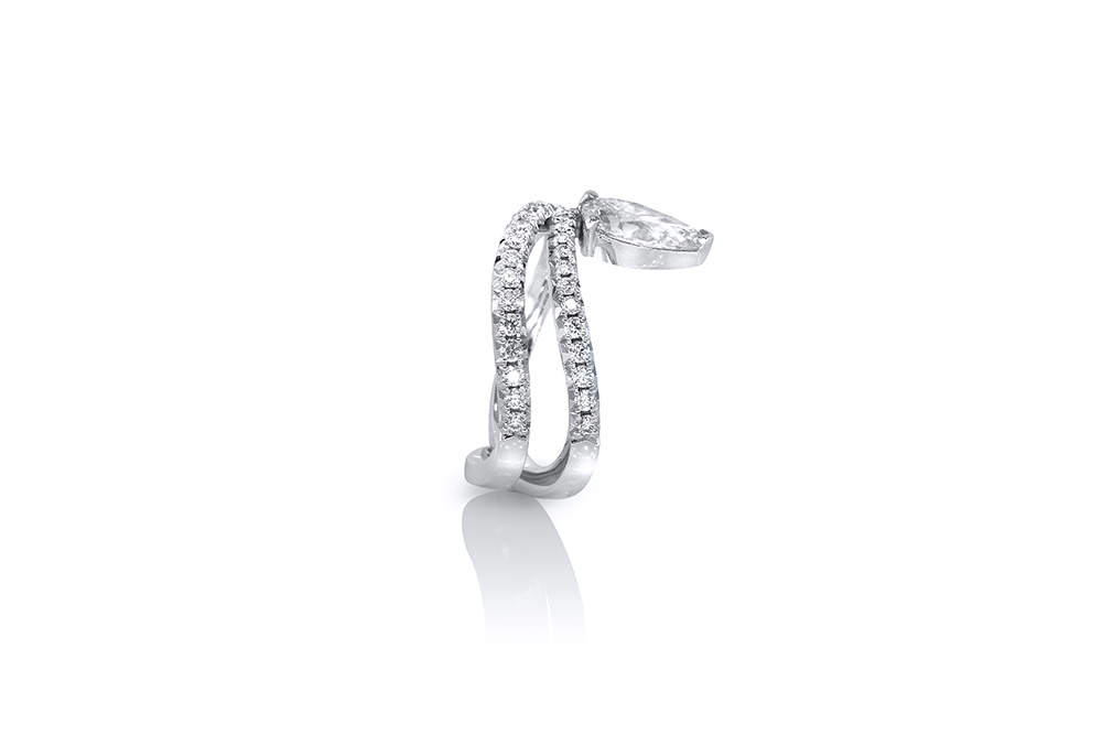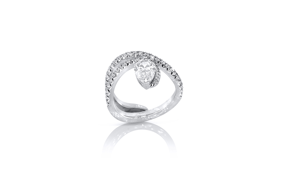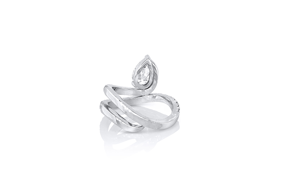 Solitaire en or blanc 18 carats et diamants, aux lignes courbes et épurées, et surmonté d’un diamant taille poire certifié. Cette bague a été conçue pour épouser les formes arrondies de l’Alliance Flow Diamants.
