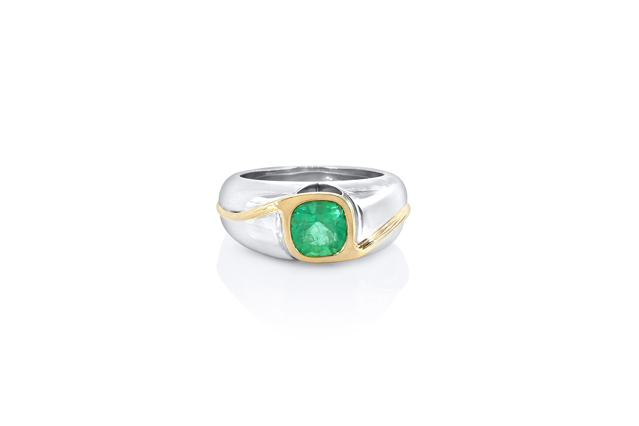 Chevalière platine, délicatement traversée par une courbe en or jaune. Celle-ci met en valeur une splendide émeraude taille coussin de près de 2 carats