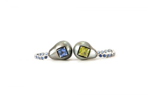 Les deux perles baroques appairées portent chacune en leur sein une pierre fine, une Tanzanite et une Titanite, ainsi qu’un splendide dégradé de Saphirs bleus.