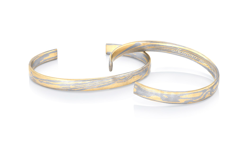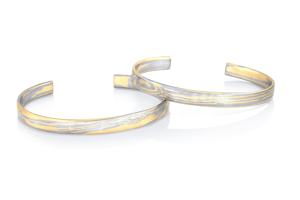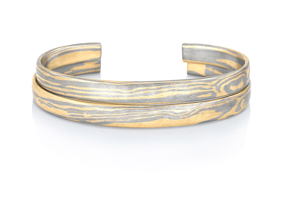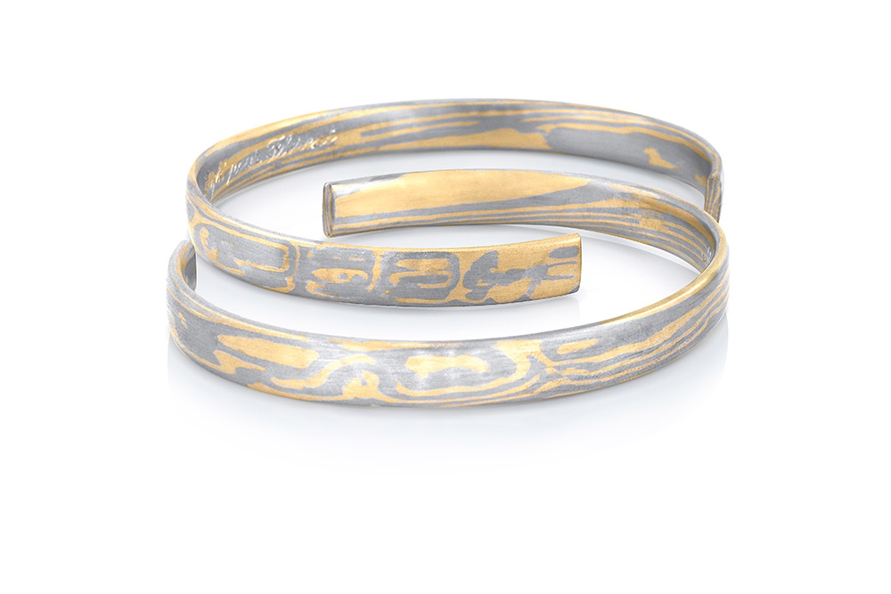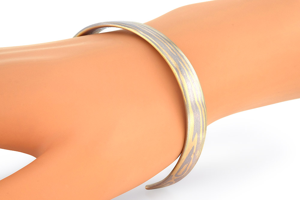Bracelet appartenant à la Collection Mokume-Gane de la Maison Arabian, basée sur une technique japonaise ancestrale permettant de produire un métal laminé dont les différentes couches sont visibles. Mokume-gane pourrait se traduire par « métal au grain de bois », décrivant ainsi l’apparence d’un métal ressemblant au veinage naturel du bois.