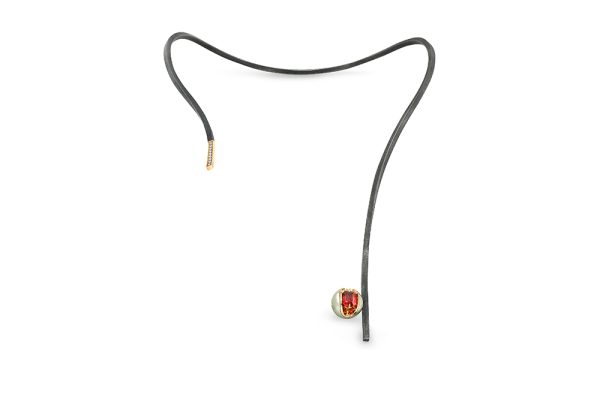 Collier unisexe appartenant à la Collection Coeur de Perle de la Maison Arabian, caractérisée par un travail original et non conventionnel autour des perles. La magnifique Perle de Tahiti qui compose ce collier a été façonnée par une coupe recouverte d’une vague d’or rouge 18 carats, et surmontée d’un magnifique spinelle rouge taille rectangle.