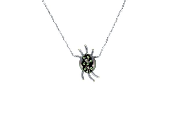 Il s’agit ici d’un ensemble de diamants jaunes et grenats démantoïde sertis dans une demi perle de Tahiti ainsi que sur le reste du bijou dans une découpe tout en rondeur et en mouvements qui évoquent immanquablement l’anémone de mer.