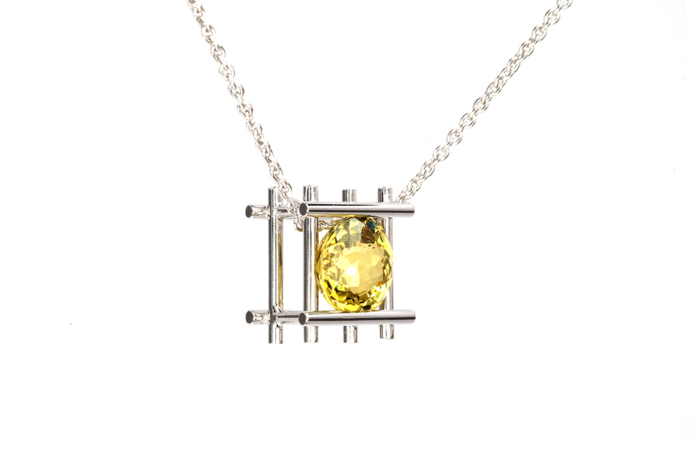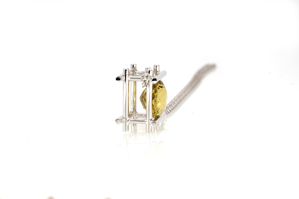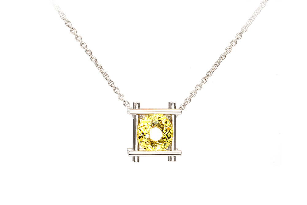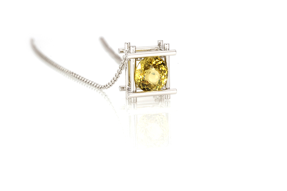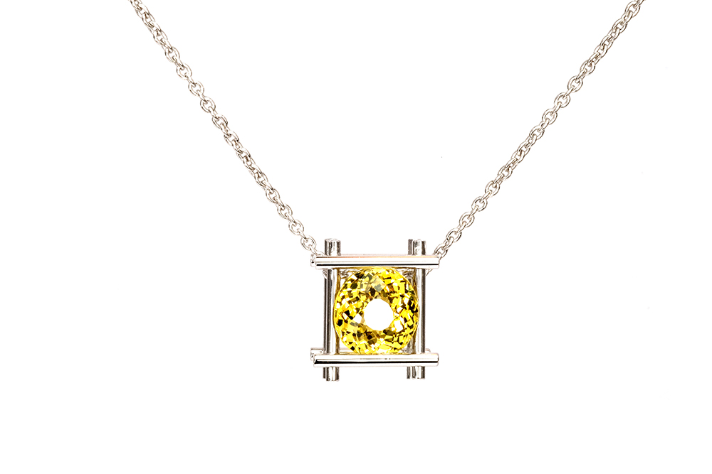 Pendentif en or jaune 18 carats appartenant à la Collection Bird Cage de la Maison Arabian, regroupant des pendentifs en deux ou trois dimensions, conçus sur la même structure mettant toujours en valeur une pierre imposante, aux couleurs atypiques.