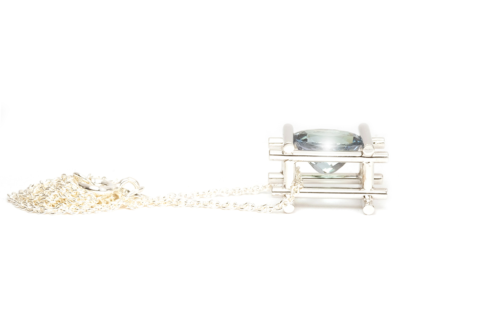 Pendentif en or blanc 18 carats appartenant à la Collection Bird Cage de la Maison Arabian, regroupant des pendentifs en deux ou trois dimensions, conçus sur la même structure mettant toujours en valeur une pierre imposante, aux couleurs atypiques.