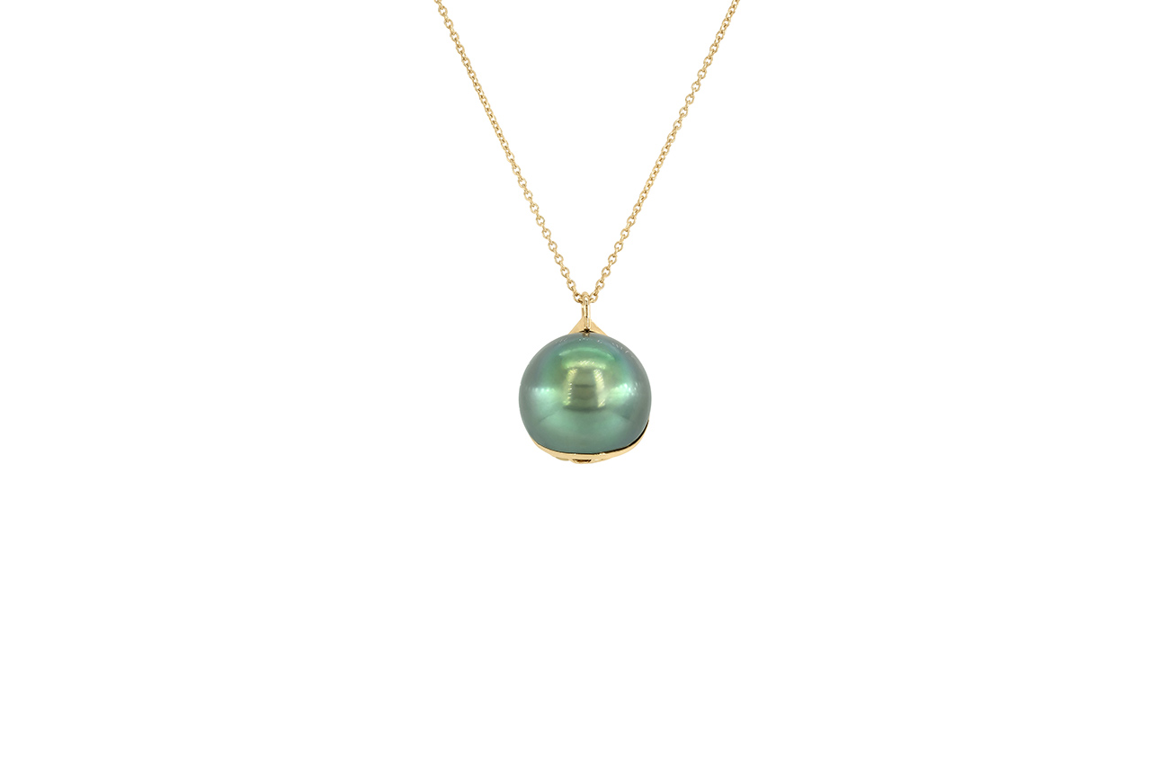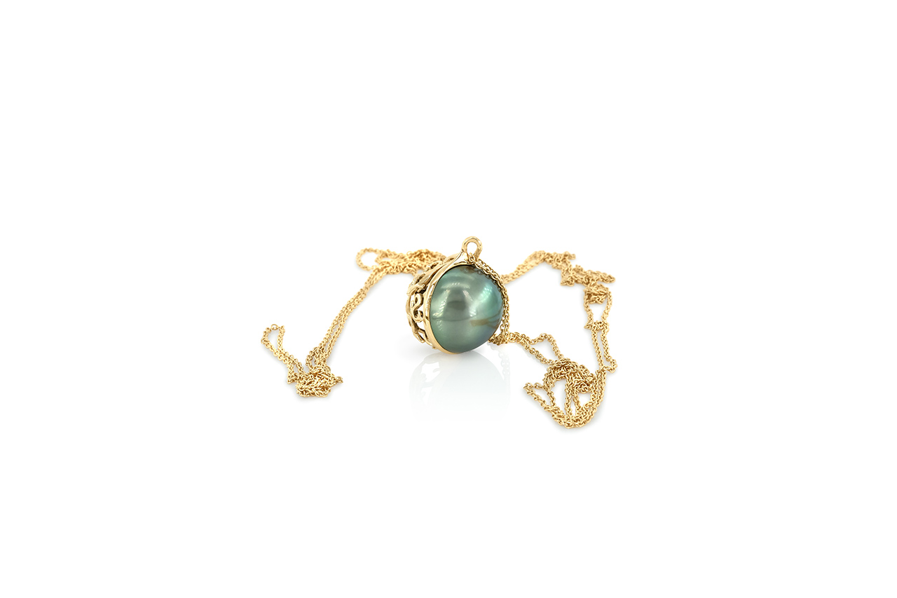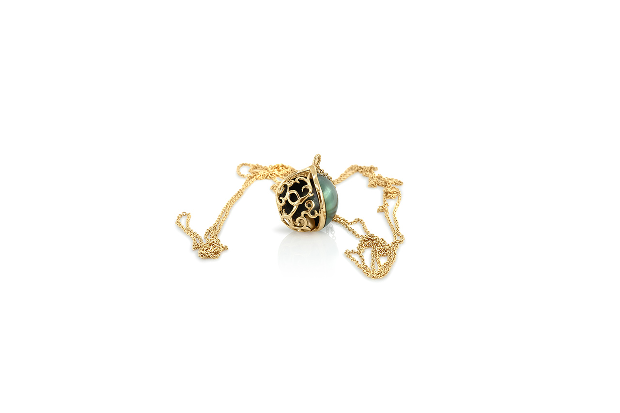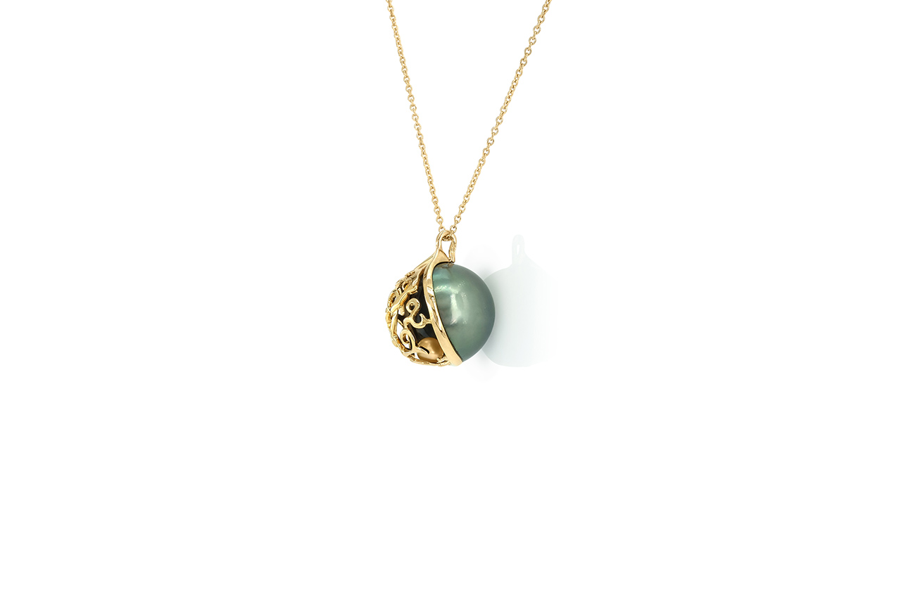 Dans le modèle présenté ici, c’est une Perle de Tahiti de plus de 16 mm qui a été évidée puis couverte d’un entrelacs d’or jaune sur l’une de ses faces, emprisonnant une perle Keshi pour un effet grelot propre aux colliers de grossesse.