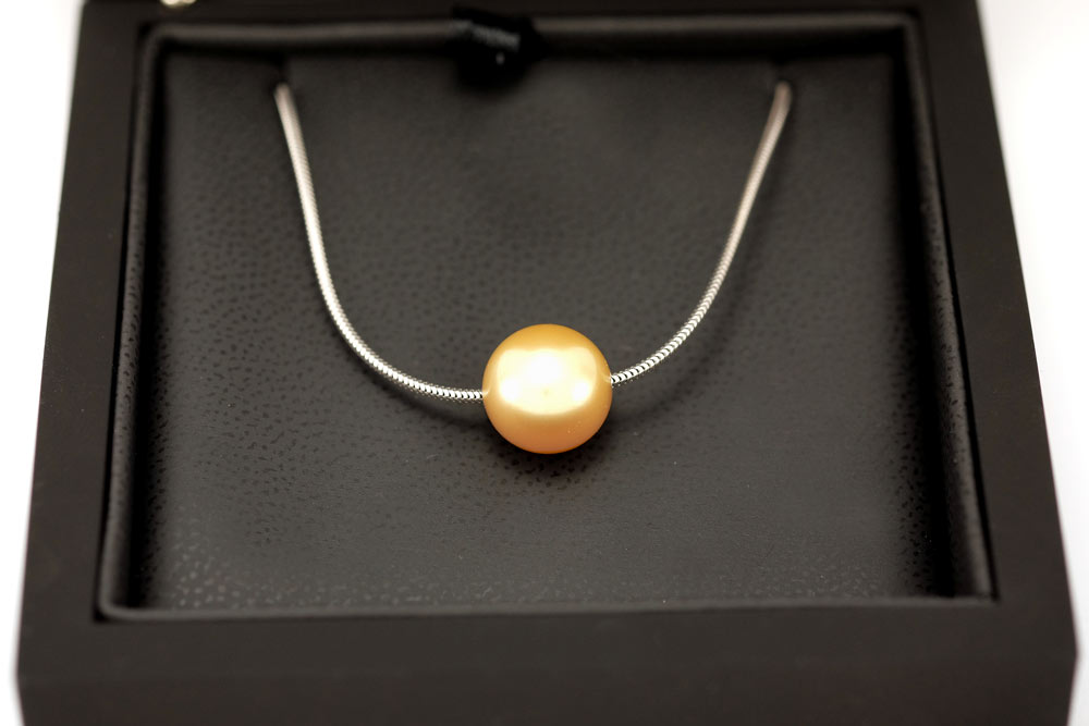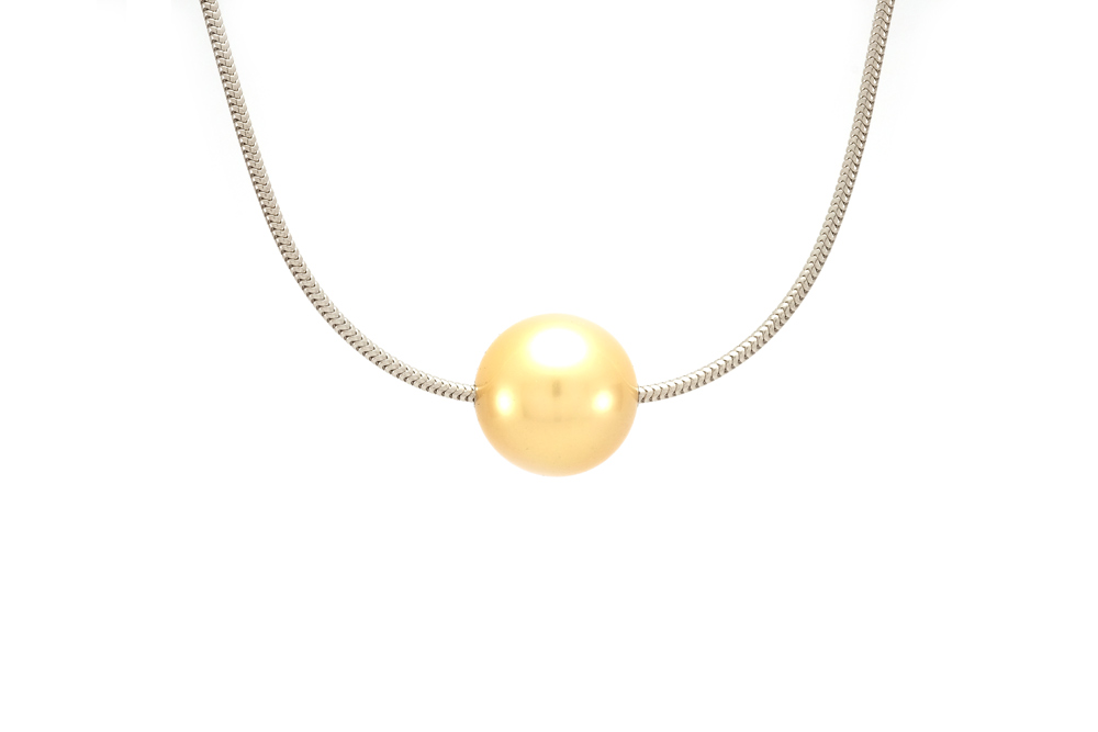 Pendentif en or blanc 18 carats constitué d’une chaîne serpentine sur laquelle est montée une perle Gold exceptionnelle de 12 mm de diamètre.