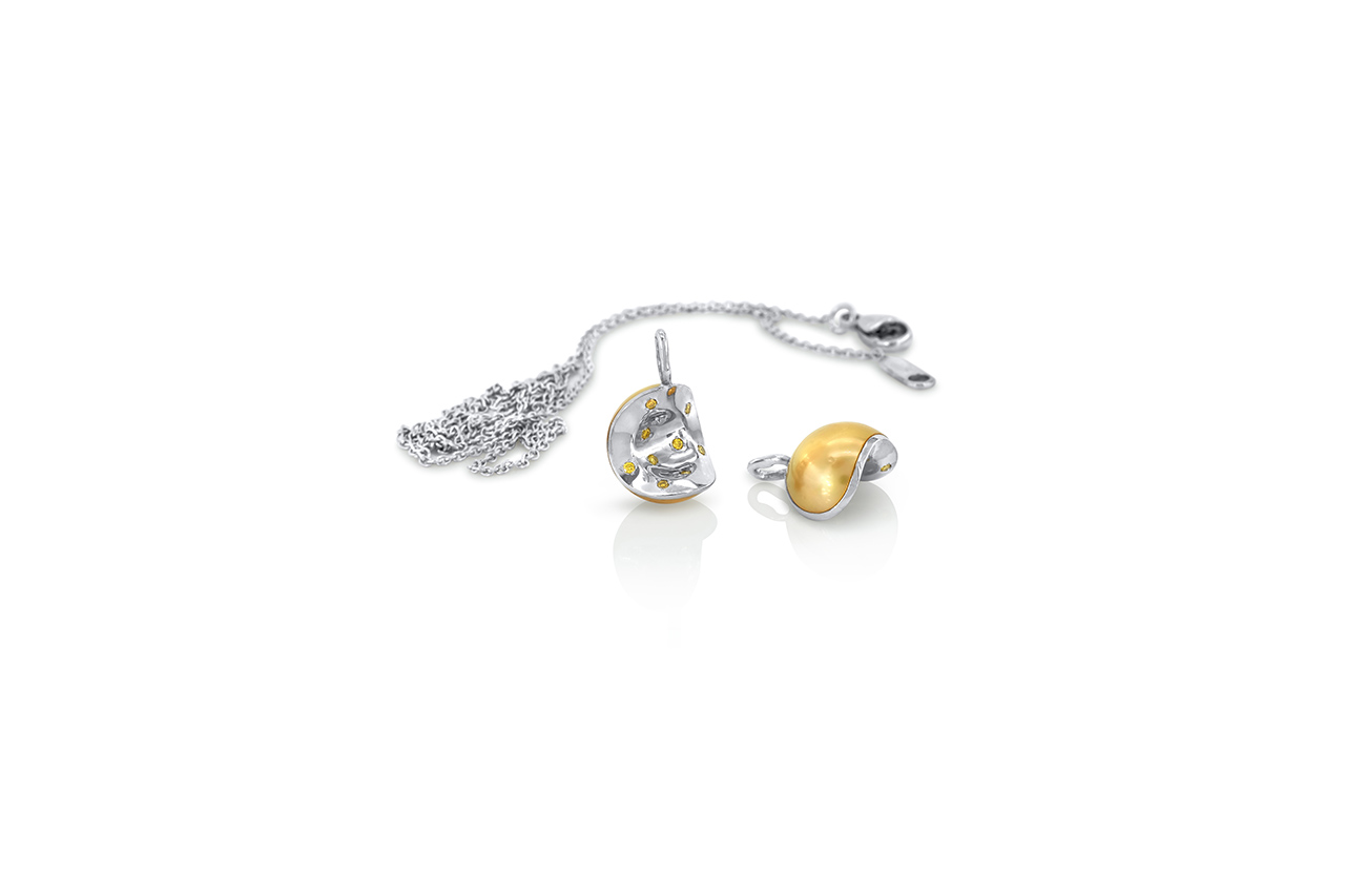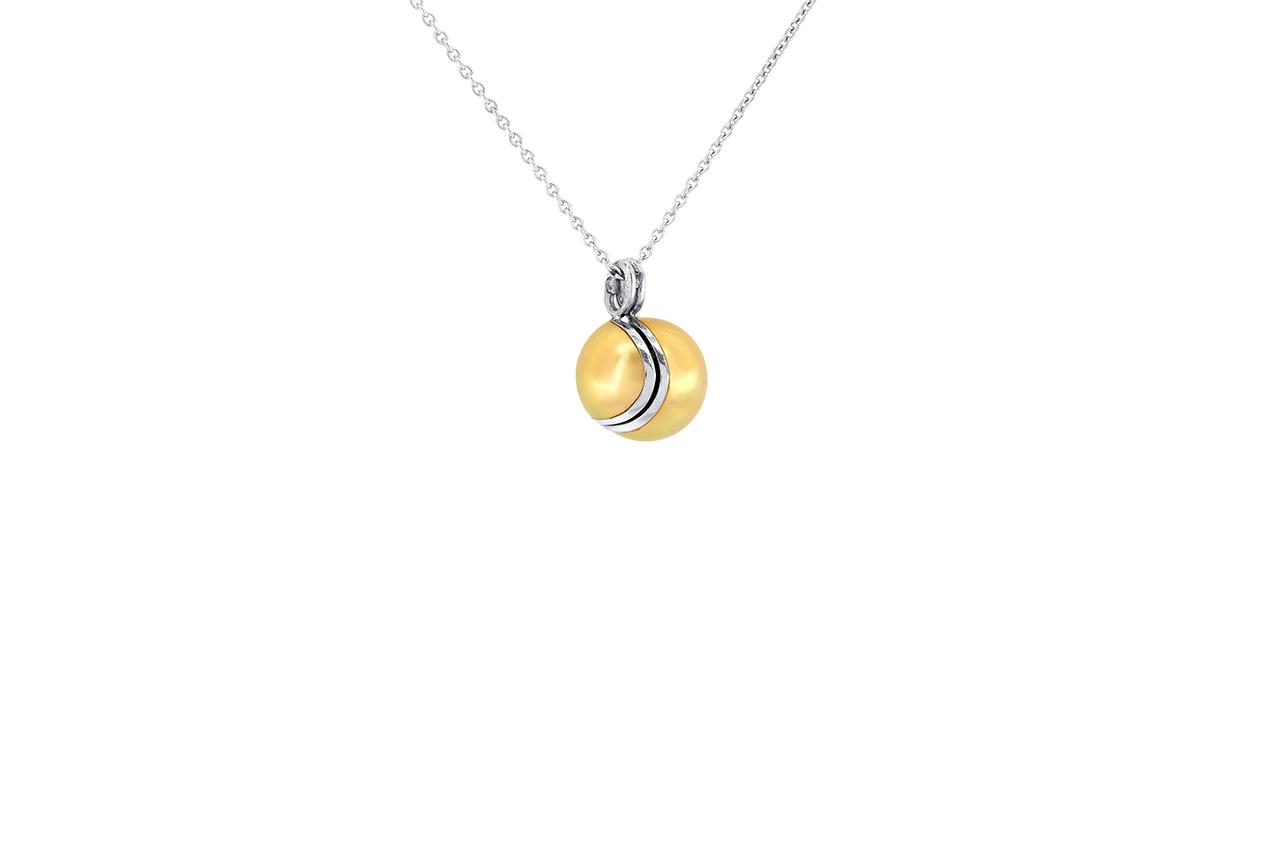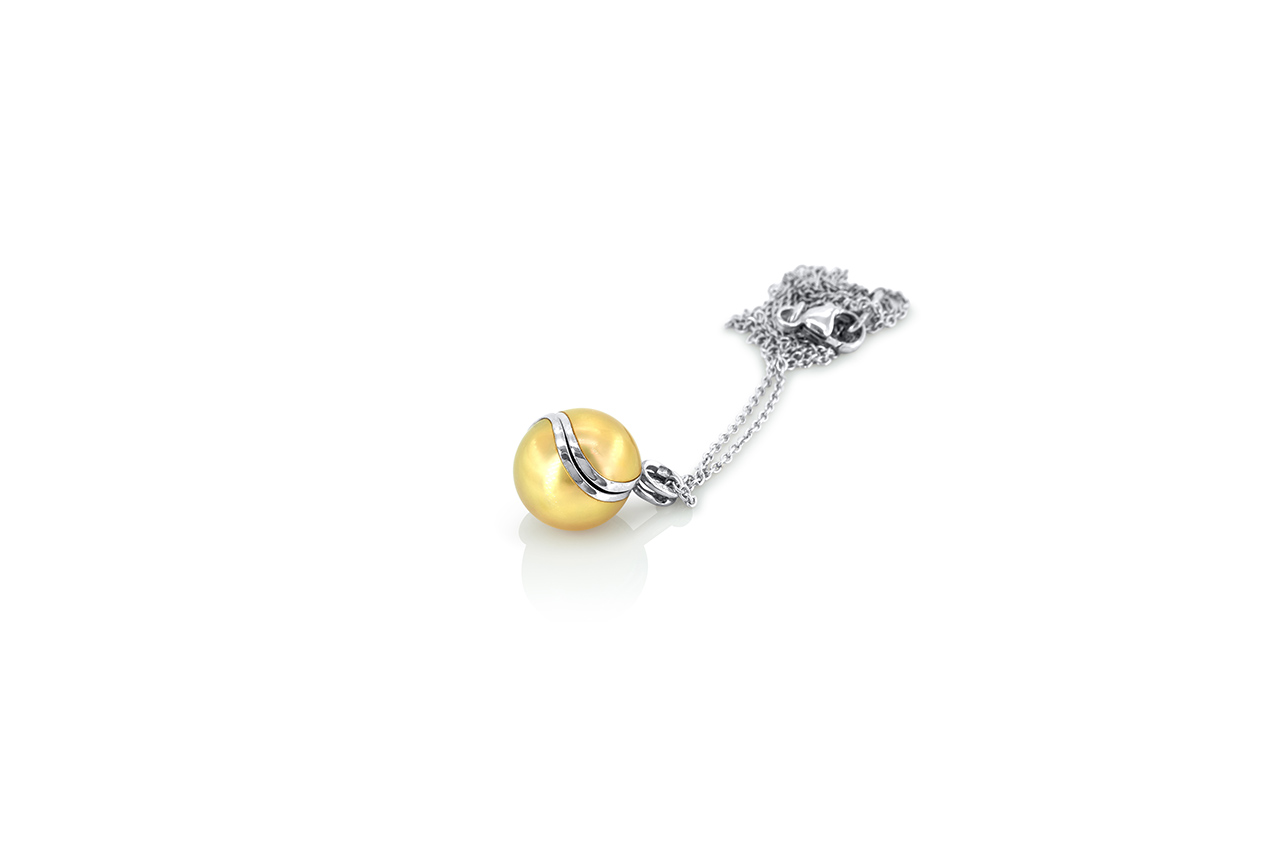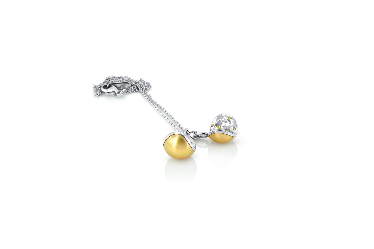Il s’agit ici d’un ensemble de diamants jaunes sertis dans une perles des Mers du Sud séparée en deux, une découpe tout en rondeur et surtout parfaitement ajustée, permettant au bijou d’être porté indifféremment seul, ou les deux sphères se faisant face à face.